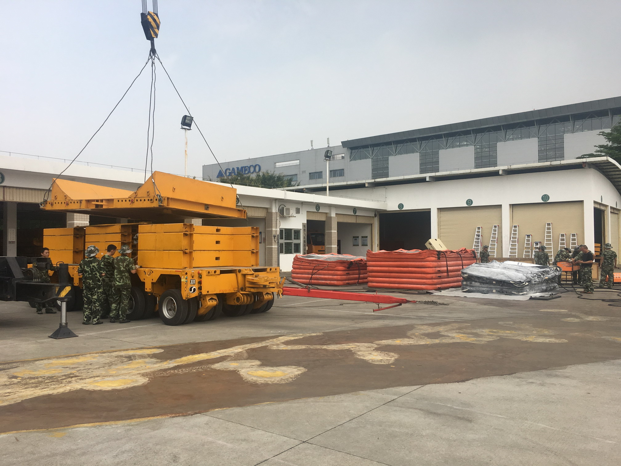 5月11日,广州白云机场上空烈日高挂,消防安保管理中心六大队24名消防战士身穿迷彩服,按搬移救援预案开展模拟训练。此次训练共耗时5小时15分,包括三组气囊顶升充气操作、单台平台拖车加高装卸操作、四组栓系固定操作的综合训练。共使用了平台拖车1台、 5吨叉车1辆、3吨叉车1辆、汽车起重机1辆、工具车1台、60吨气囊2组、40吨气囊1组、打气机等设备。