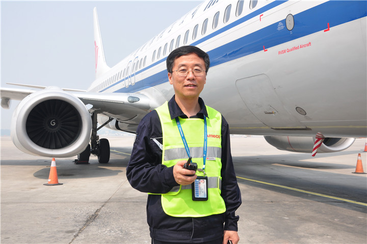 “塔台,飞机调班,要拖至451机位”,某日,在首都机场T3航坪,一位身穿Ameco工作服,文质彬彬的机务人员手拿对讲机,在现场与机场各部门协调,此时,距离航班出港还有1个小时,时间非常紧迫,但从他的脸上看到的是自信和从容。