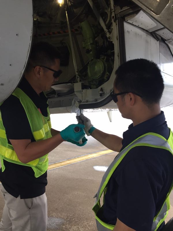 当时珠海机场下着大雨,又加上落地后使用反推,反向气流将雨水打到轮舱里面,打湿的轮舱、淋湿的地面,根本分辨不清油和水,无形中增加了寻找漏点的难度。