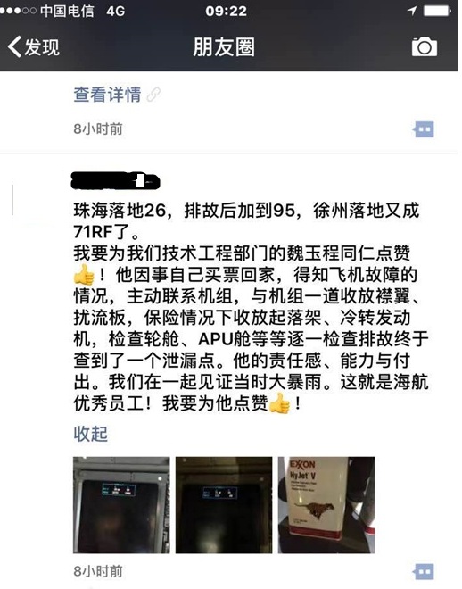 当天执行航班任务的机长事后在自己的朋友圈发了这么一段温暖的话“我要为我们技术工程部门的魏玉程同仁点赞!他因事自己买票回家,得知飞机故障的情况,主动联系机组,与机组一道收放襟翼、扰流板,保险情况下收放起落架、冷转发动机,检查轮舱、APU舱等等逐一检查排故终于查到一个泄漏点。他的责任感、能力与付出,我们在一起见证当时大暴雨。这就是海航优秀员工!我要为他点赞!”。