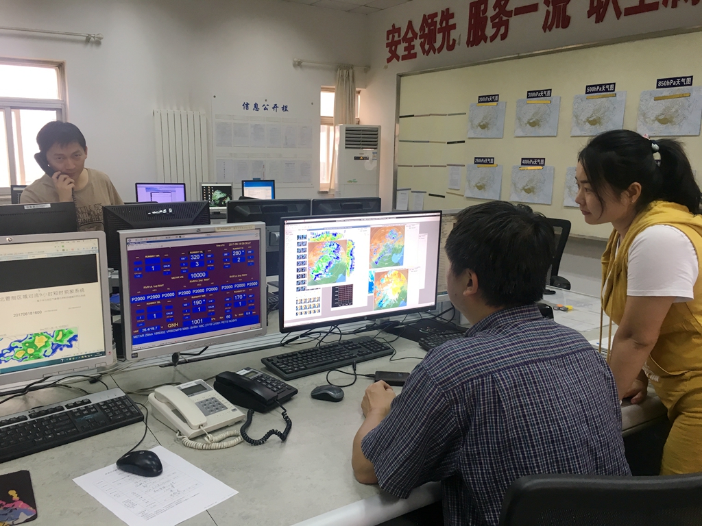 18日中午12时20分时,一直紧盯雷达的临近预报员发现在首都机场正西边200公里处冒出一小块回波,此时回波强度还非常弱,但已经引起了我们预报员的高度重视,预报领班及时组织了临时天气会商,通过结合当天的天气形势以及参考华北管制区对流天气6小时数值模式预报系统,准确判断了未来西部的这小块回波和北部的回波会合并加强,并东移影响首都机场,并在12时40分及时发布了雷雨预警。雷雨时间确定后,及时以通报窗口、微信平台、短信、电话等形式通知运管中心、空管中心、总局气象中心、航空公司、TMCC等有关部门,0530z启动大面积航班备降保障程序。同时临近预报员还及时通过视频会商系统把结论及时通知了有关部门。