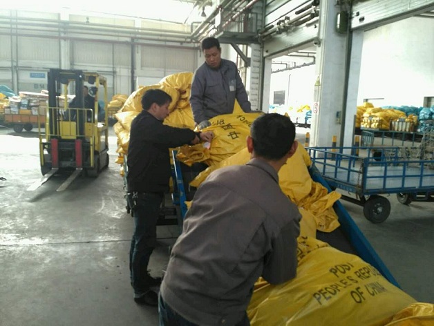 图:南京机场:一批出港国际邮件正在入库,赶航班,小伙子们仔细着点,扫描准确点,速度快点,动作麻利点!摄影:张敏!