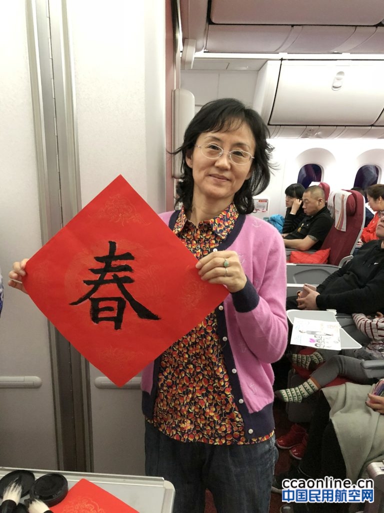 在旅客享用完热腾腾的饺子后,机上主题活动正式开始。首先是“福到啦”写福字活动,旅客李先生在万米高空现场挥毫,为其他旅客送去新年祝福。紧接着,以新制服为主题的“对对联”活动掀起了机舱内的一波高潮。旅客们纷纷参与进来,以“海天祥云”为题,对出了多对佳句。其中,旅客王女士对出的对联--“海天一色任远航,祥云万朵映新朝”,横批“辉煌起航”赢得了大家热烈的掌声。