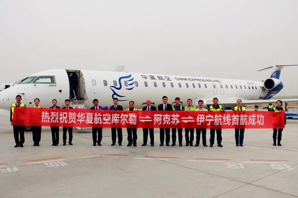 中国民用航空网通讯员刘刚讯:4月10日14时22分,从库尔勒机场起飞的华夏航庞巴迪CRJ-900型飞机平稳降落在阿克苏机场,并于15时30分由阿克苏机场起飞至伊宁。这标志着库尔勒—阿克苏—伊宁航线首航成功并正式开始运营。