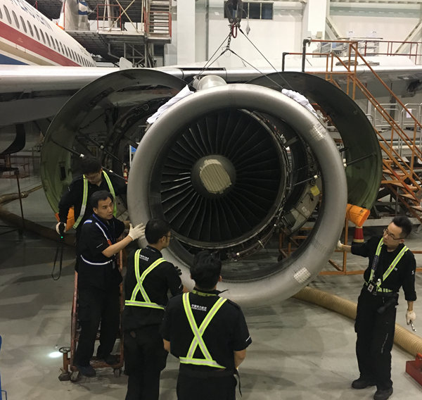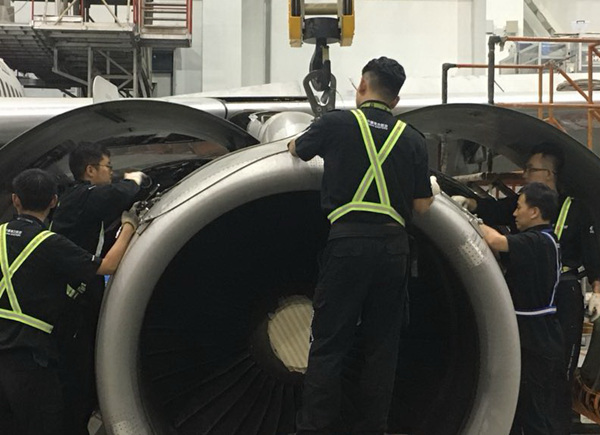 接到通知已是深夜,员工们都已经休息了,而且机库停场4架飞机检修,15日还有另外一架A检飞机进场,定检部一车间主任王永斌接到该任务后,根据定检工作情况立即协调组织安排,决定由一车间发动机工段和大翼工段各派两名技术人员完成此项紧急任务。