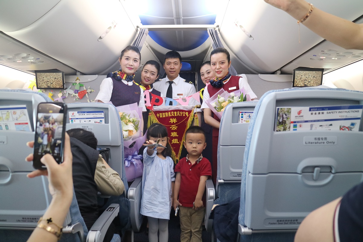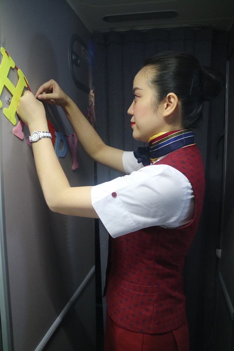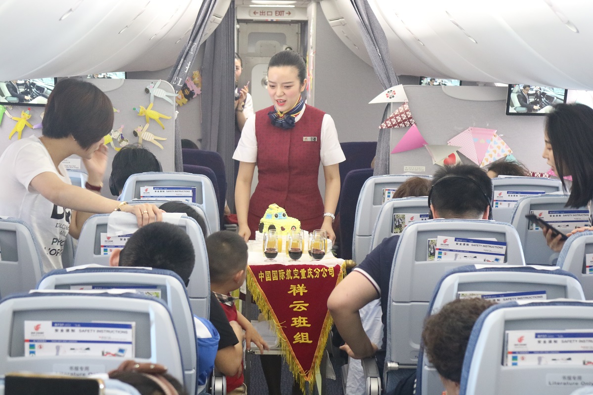 为了能给机上的小旅客打造一个童真无瑕的小世界,国航重庆分公司特地安排最新引进的波音737MAX-8型飞机执行任务。在飞行前,乘务组对机上特色活动进行了精心策划,并早早进入客舱进行准备。醒目的小标语、富有童趣的漫画等,装扮后的客舱洋溢着浓浓的节日气氛。