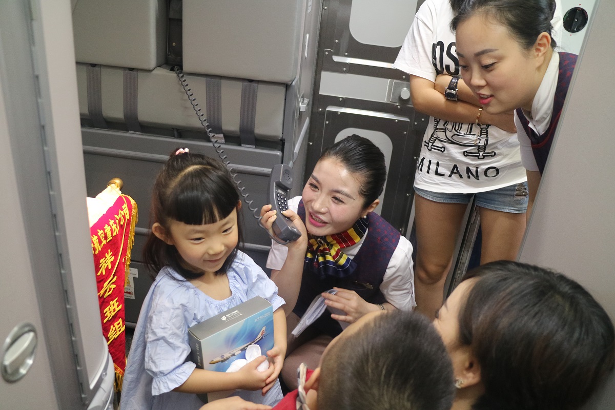 在航班上,小旅客们十分踊跃。“送去五月的芬芳、迎来六月的阳光。我们迈着喜悦的步子走进六月,走进了六一儿童节... ...”,当客舱广播里传来乘务长尹晶甜美的声音时,小旅客们的情绪逐渐高涨起来。