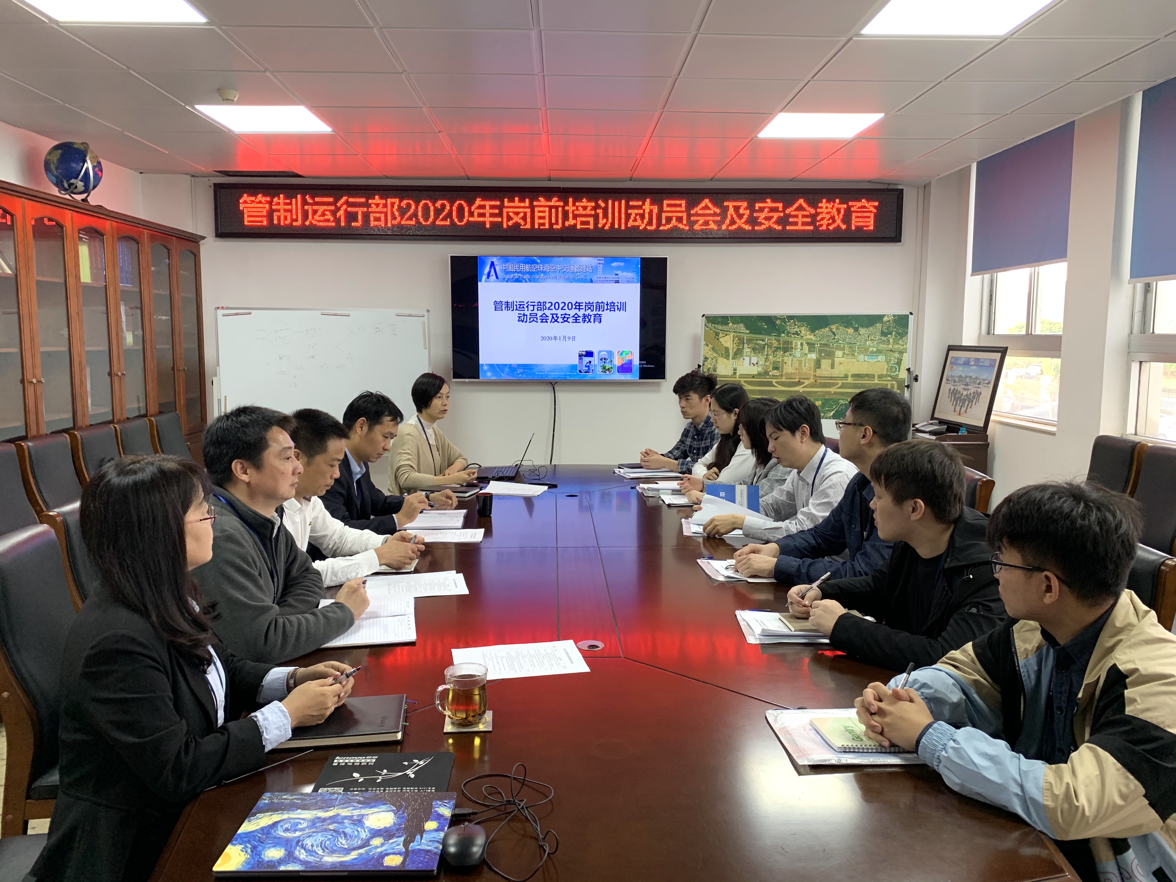 2020年1月9日上午,珠海空管站管制运行部在航管楼二楼飞行讲解室召开2020年见习管制员岗前培训动员会,管制部领导、技术业务室人员及七名见习管制员参加动员会。
