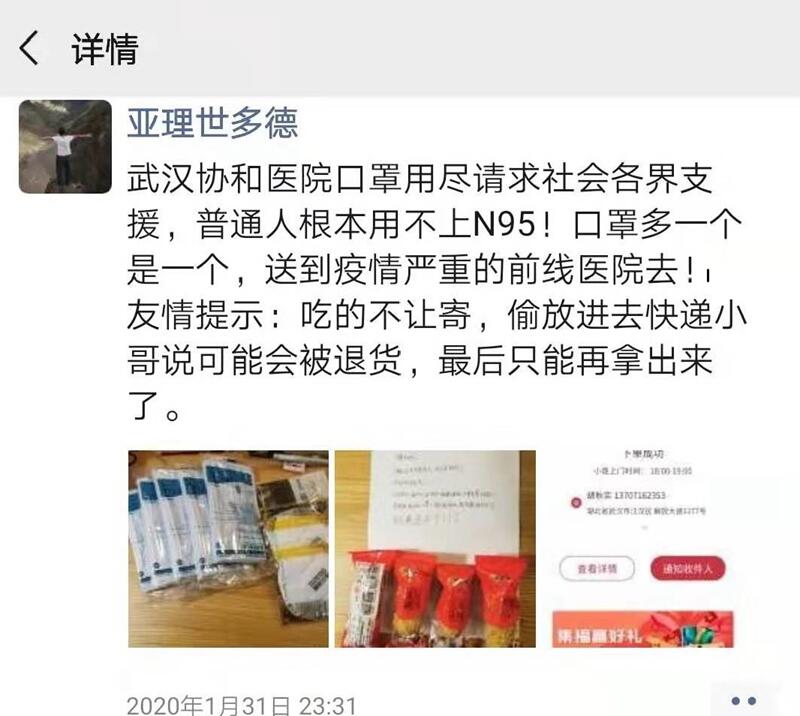 于是,他以最快的速度联系好了快递,将家里的N95口罩全部打包寄往武汉协和医院,顺便他还想偷放一些吃的进去,以表达自己对前线“逆行者”们的敬意,但快递小哥友情提醒说,吃的会被退货,他只好把“爱心零食”取了出来。