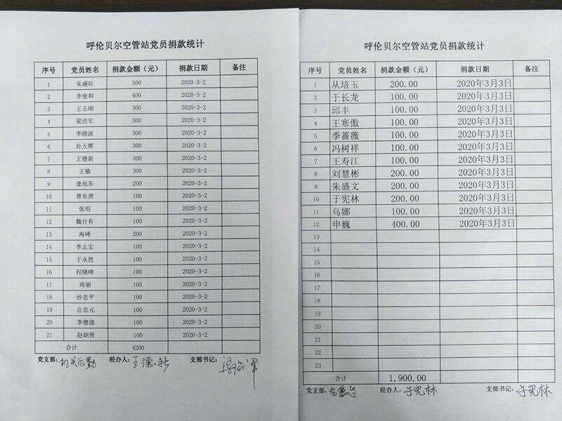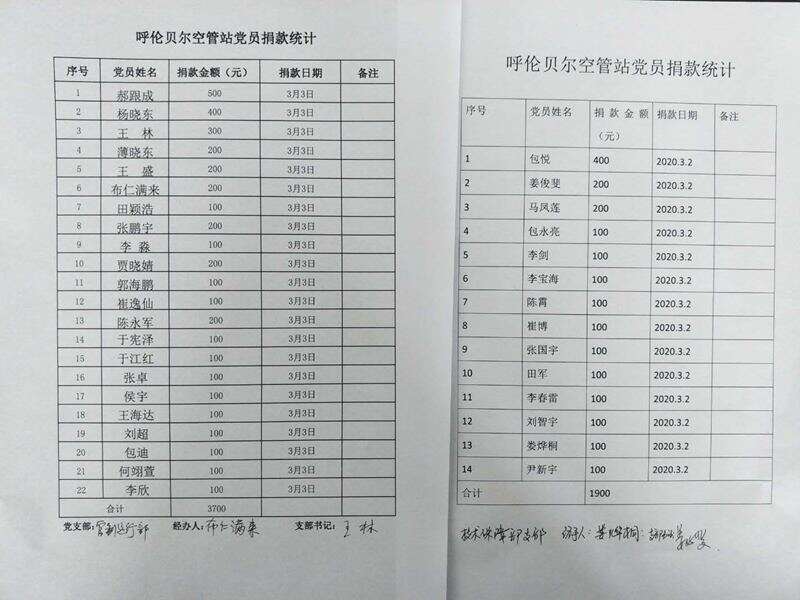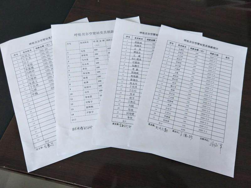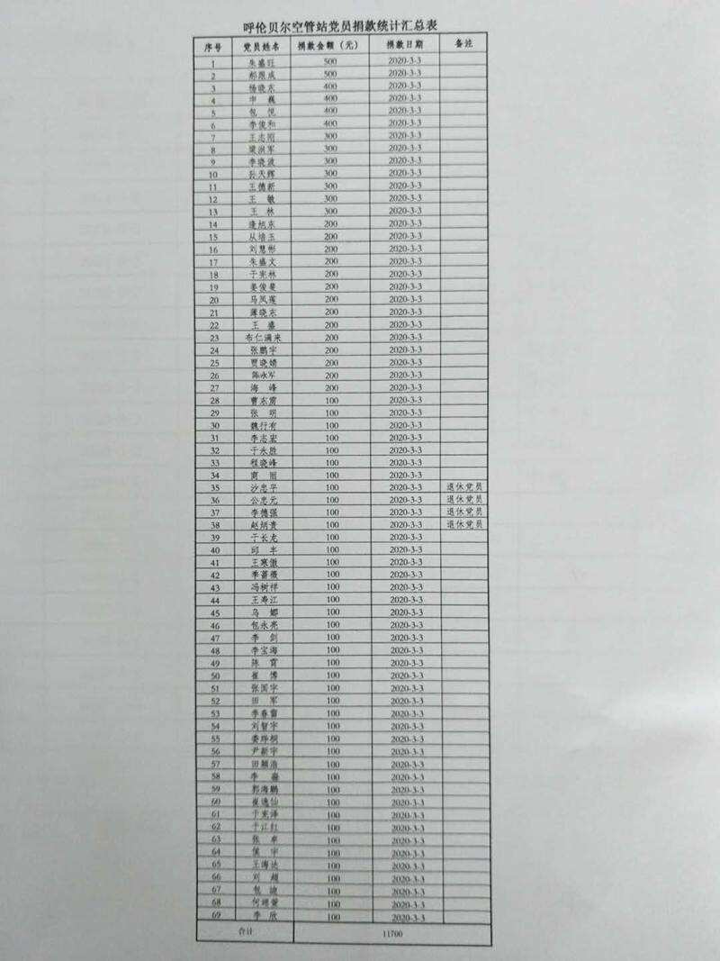(通讯员:孙天辉)2020年3月3日,为响应中共中央组织部关于组织党员自愿捐款支持新冠肺炎疫情防控工作的号召,呼伦贝尔空管站党委认真落实民航局空管局和华北空管局党委要求,积极组织开展党员自愿捐款支持新冠肺炎疫情防控工作,我站共有69名党员,全部积极主动自愿进行捐款,共计捐款金额11700元。