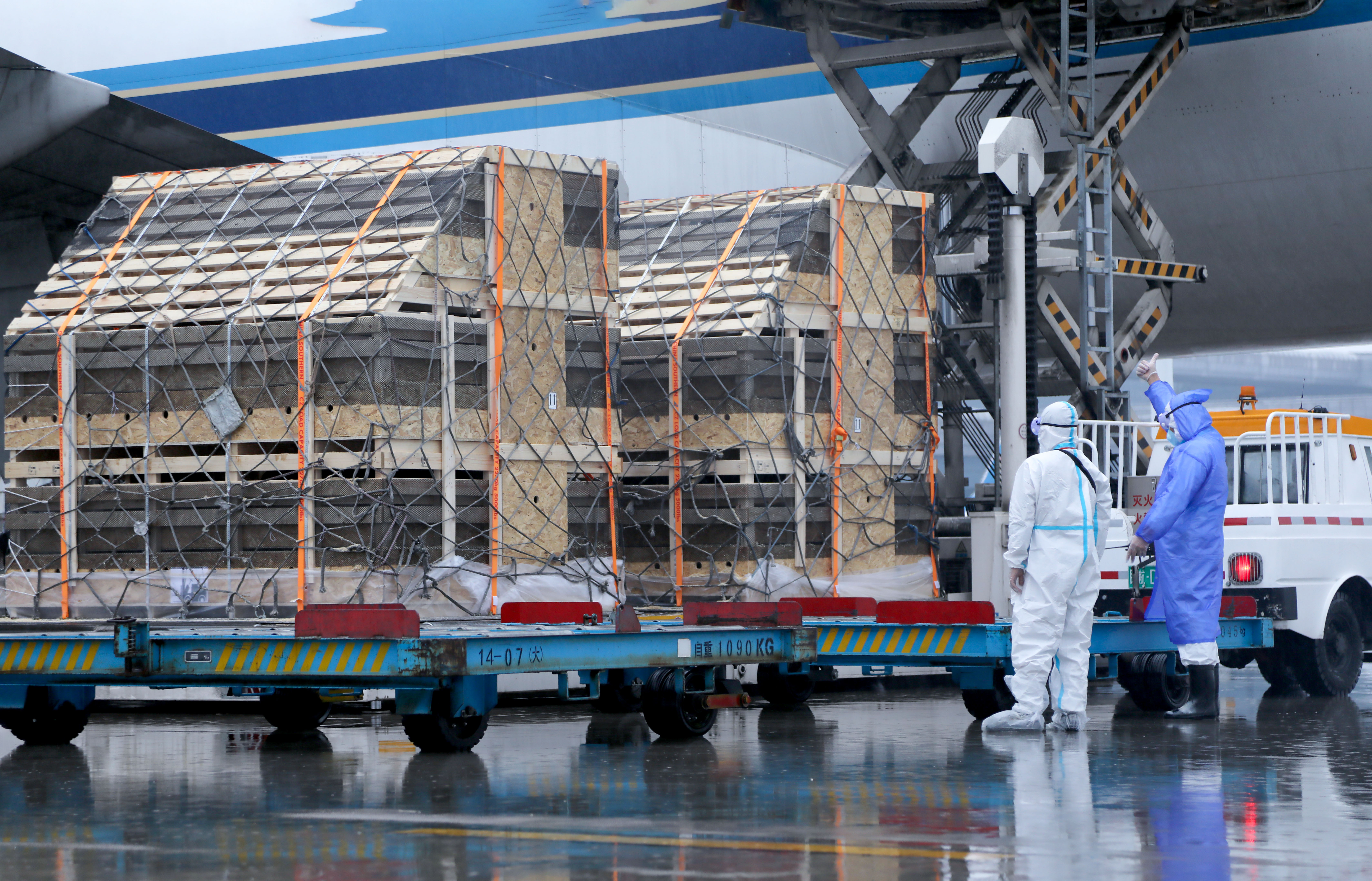 由于这也是南航全货机首次落地贵阳,贵州当地工作人员同样承担艰巨的保障任务。南航货运、飞机维修厂、运指、地服等多部门在第一时间成立了“大白保障专队”,加强联动、实时沟通保障信息,约一个小时即完成种猪卸货;同时,南航与贵阳海关等联检单位联合开通“快、专、优”的种猪检疫通关绿色通道。种猪落地快速完成相关检验检疫手续后,立刻被运往隔离点,为后续地面高效、安全运输打下坚实基础。