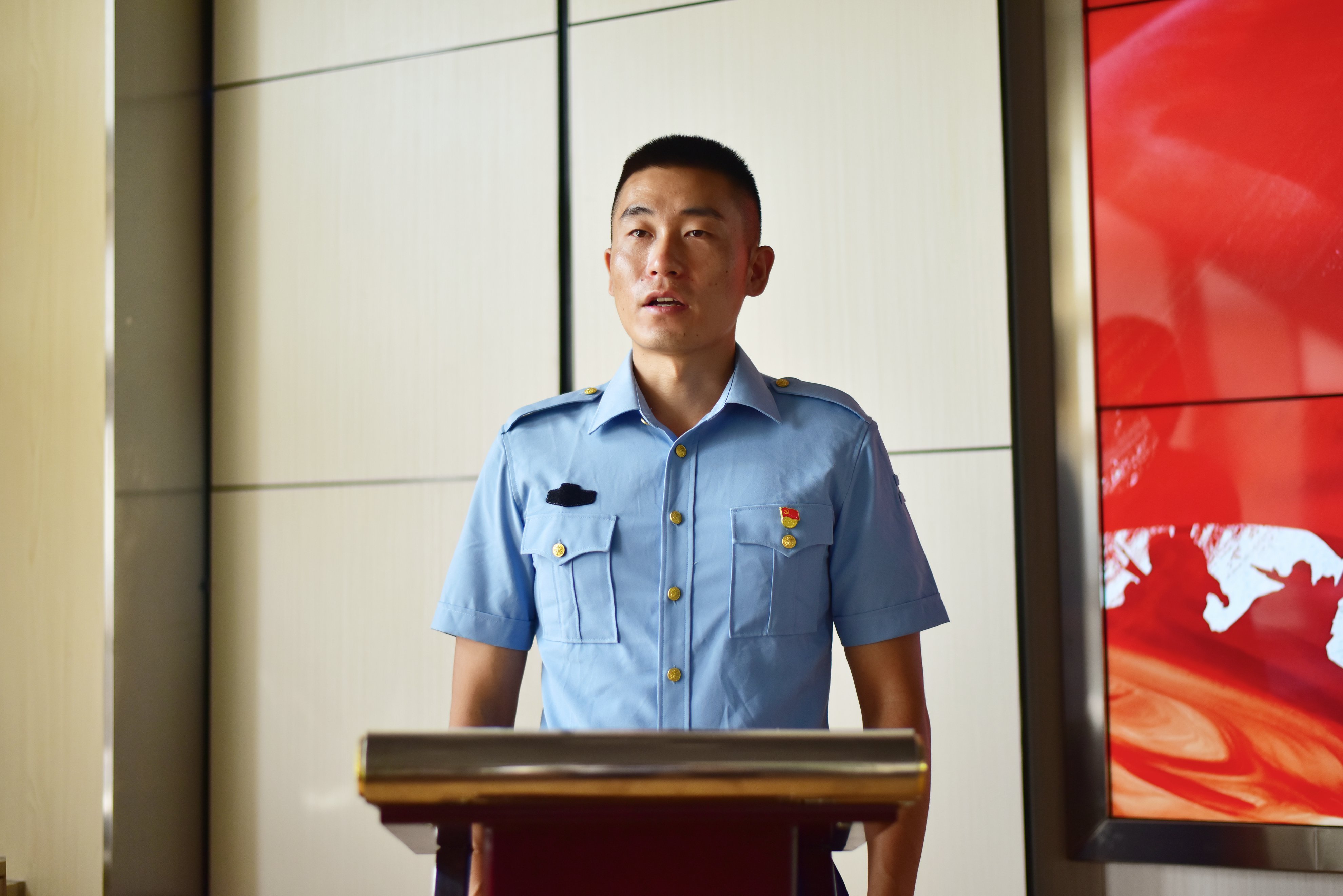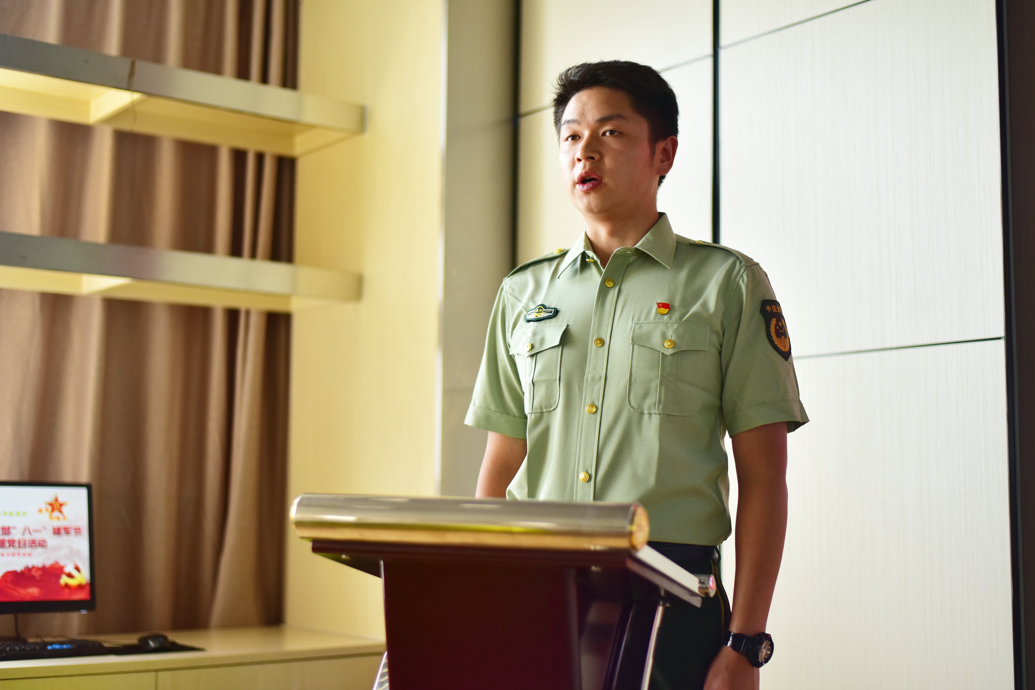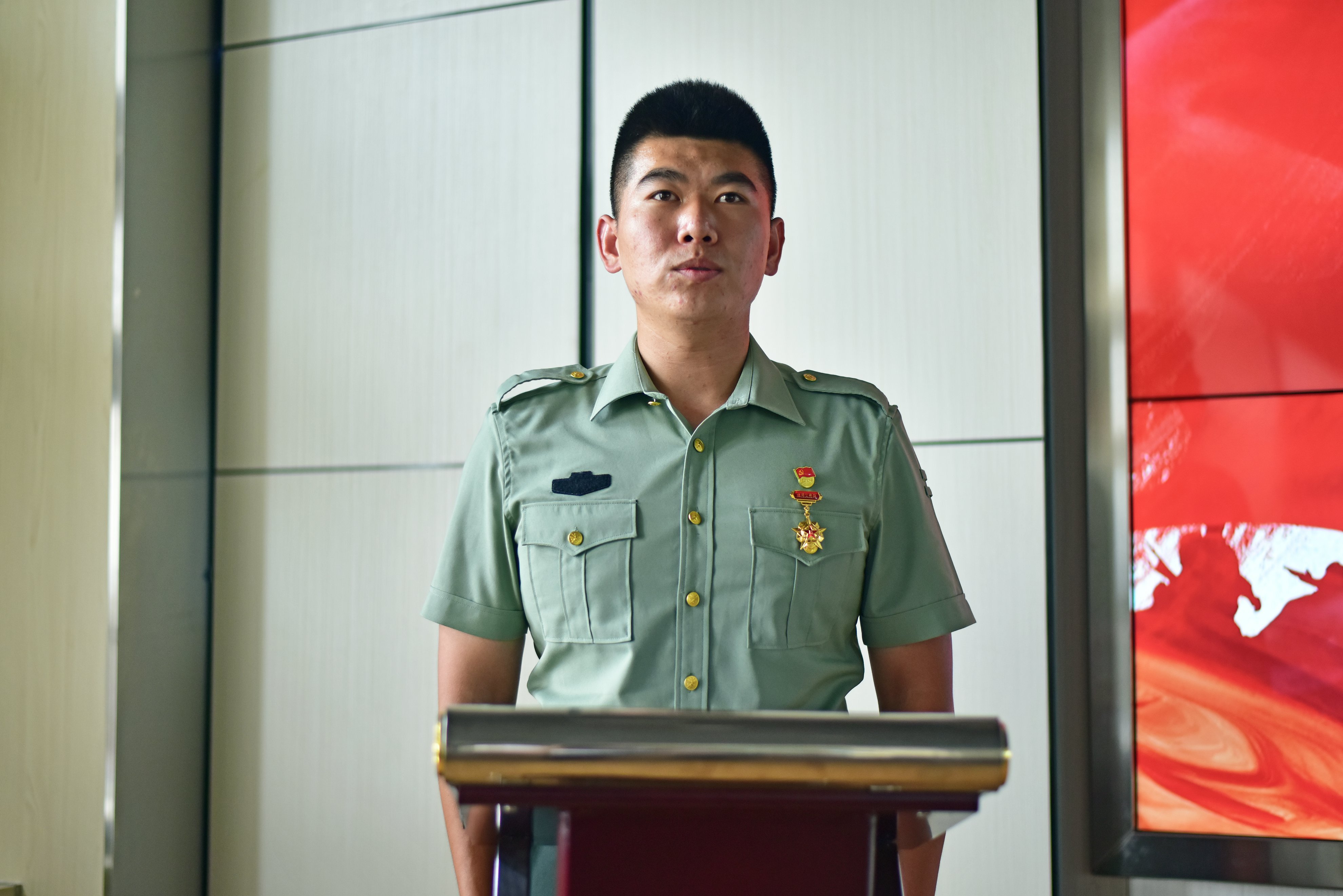首先走上讲台的是保卫团总支书记,曾服役于空军某部队的闫海杉,回忆起曾经的军旅生涯,他慷慨激昂的说到:从小受到《士兵突击》的影响,羡慕军人、崇拜军人、立志从军,从刚进部队憧憬、慢慢的坚持、慢慢的感受到光荣与自豪,当兵后悔两年,不当兵后悔一辈子,参军入伍是使命把我们召唤在一起,部队上战友们都来自五湖四海,但我们都有一个共同的名字——中国军人。不同的血脉,不同的姓氏,同吃一锅饭,同扛一杆旗,有乐一起享,有难一起扛,几年的青春相依相伴,在回顾了几年部队生活的心理历程后,闫海杉激动的喊出“退伍不褪色,永葆军人本色”的口号,令人发自心底的佩服。