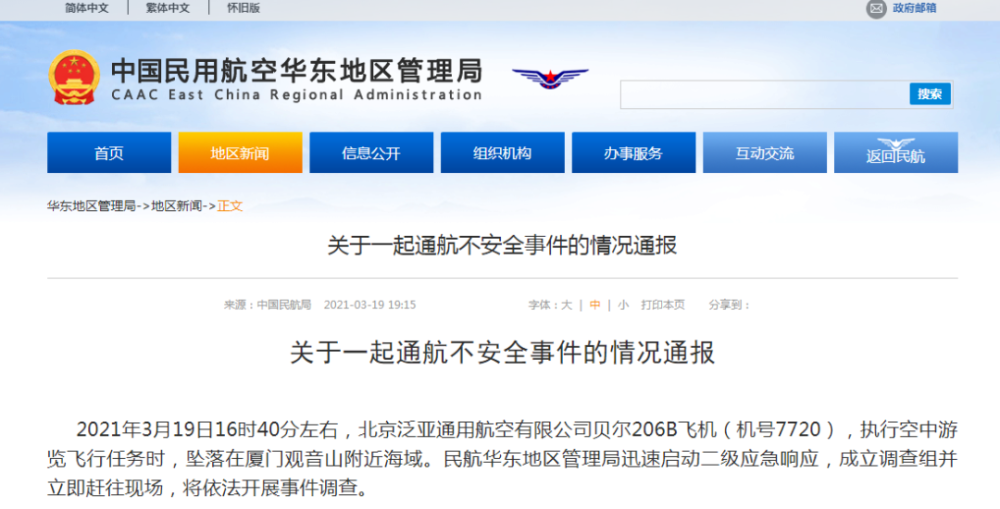 民航局华东地区管理局网站3月19日发布《关于一起通航不安全事件的情况通报》:3月19日16时40分左右,北京泛亚通用航空有限公司贝尔206B飞机(机号7720),执行空中游览飞行任务时,坠落在厦门观音山附近海域。