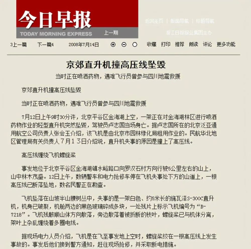 2008年7月12日上午9时30分许,北京平谷区金海湖上空,一架正在对金海湖林区进行喷洒药物作业的轻型直升机突然坠毁,驾驶员卢志国当场身亡。