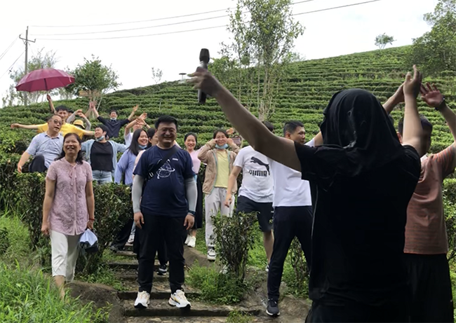 第二站是参观当地主要的特色经济产地茶山,了解茶山文化和茶叶的制造过程,大家在游览过程中拍照留念,欣赏茶山的美景,遗忘了平时工作繁忙这一状态,放松了心情,舒缓了压力。