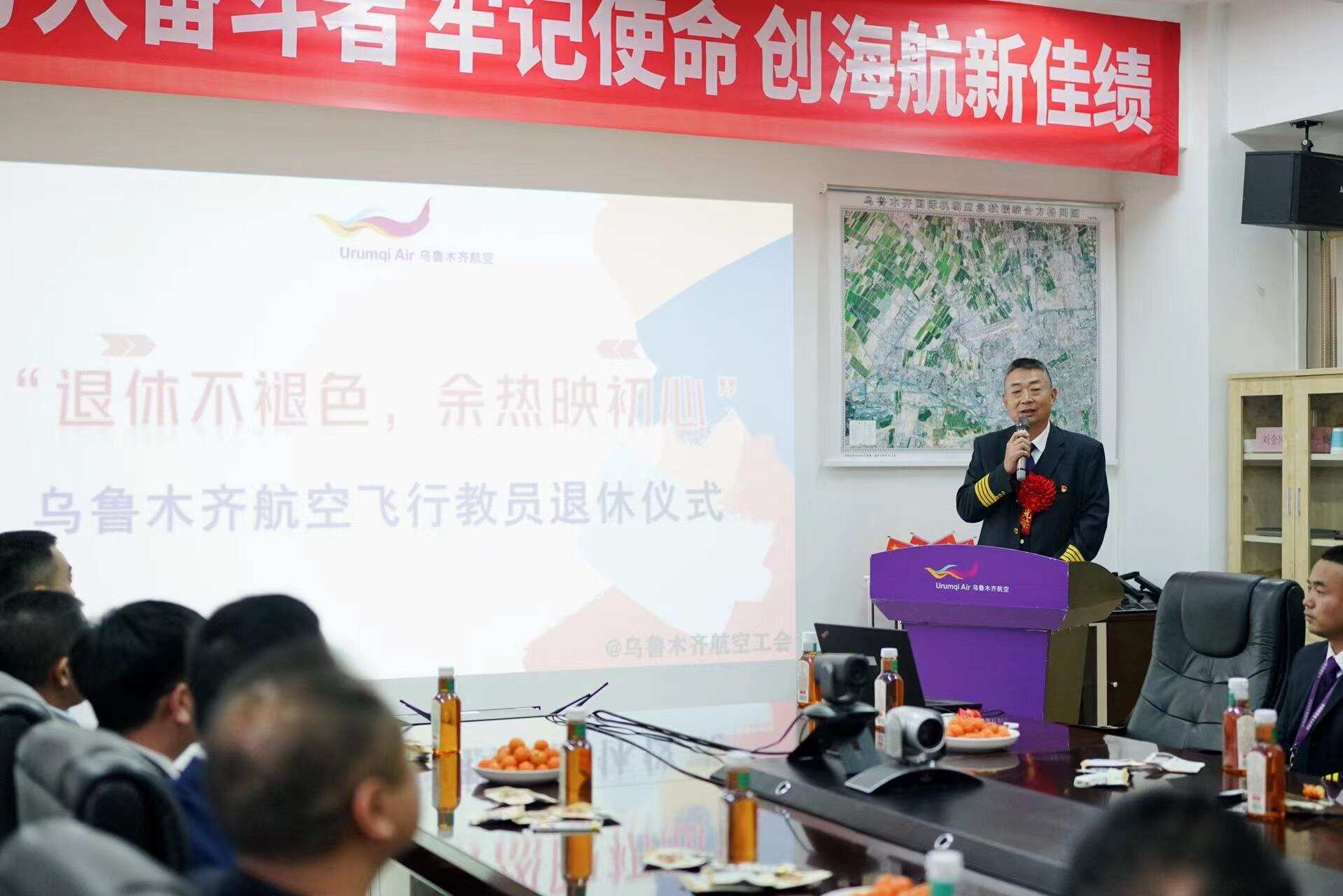 (通讯员 王玉才、麻洛齐)2023年2月24日,海航航空旗下乌鲁木齐航空邀请董事长全勇、党委书记谌姜朴、运行副总裁张洋、安全总监王强、总飞行师徐庭剑为范润龙、陈保顺、王耀明和由茂四位飞行教员举办了一场温馨的退休仪式,乌鲁木齐航空飞行部总经理刘盼刚、副总经理张亮、副总经理李雯和飞行员代表共同参加此次退休仪式,大家对四位飞行教员光荣退休表达不舍与祝福。