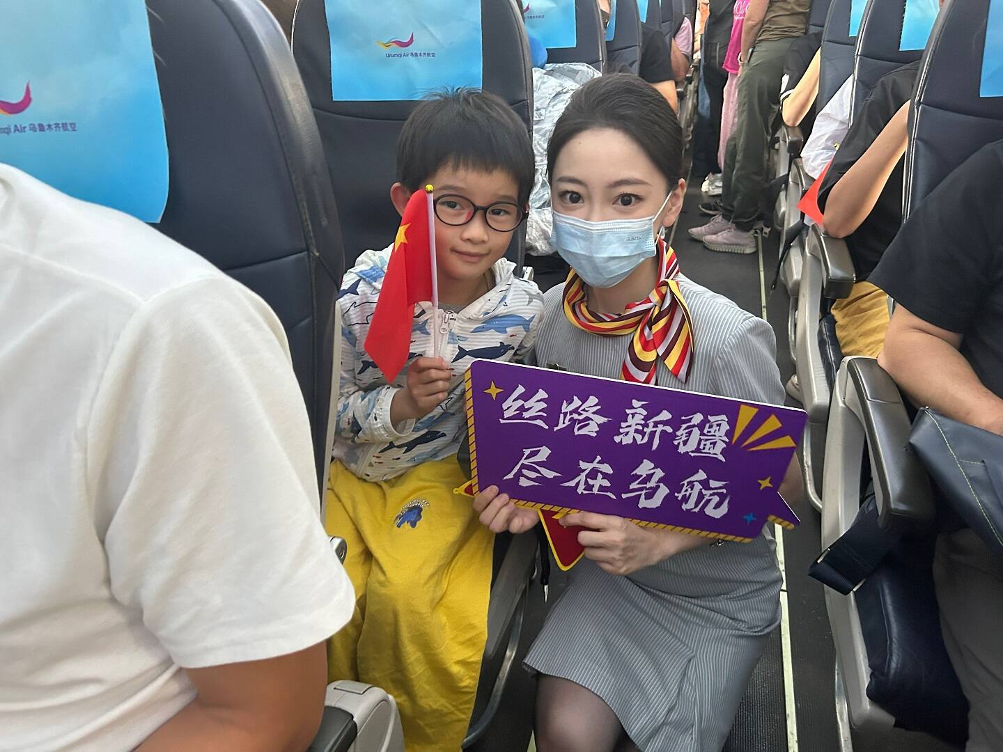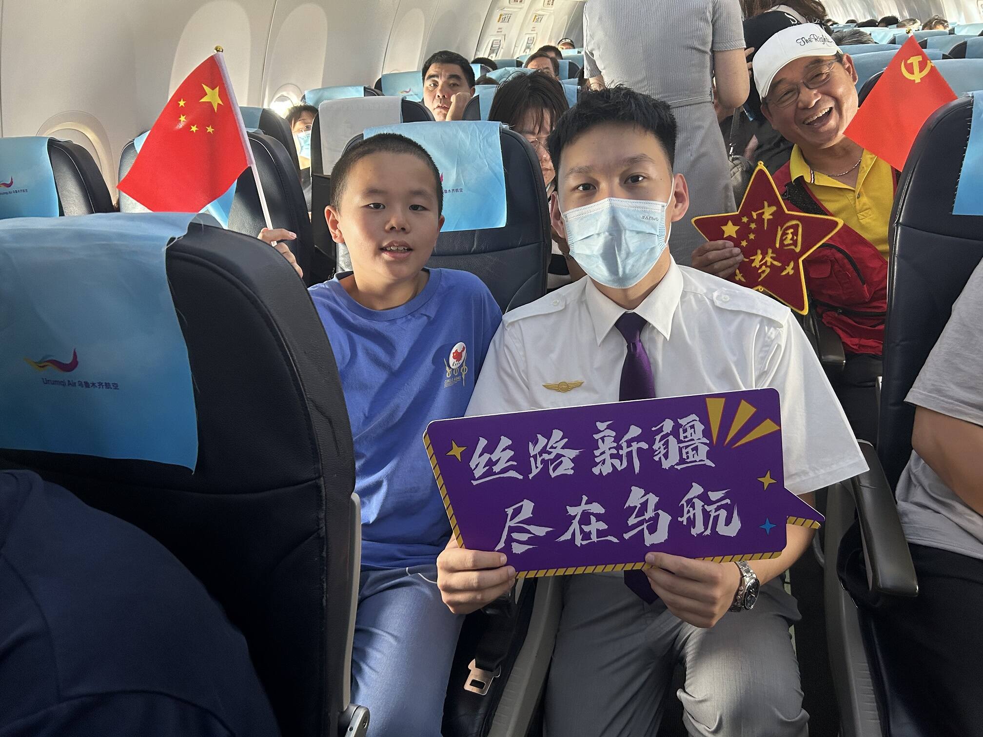 航班顺利起飞进入平飞状态后,乘务长带领组员向客舱中的旅客行礼致意,并为旅客们分发小道具,号召旅客参与互动。“大家好!欢迎您选乘海航航空旗下乌鲁木齐航空‘永远跟党走,奋进新征程’主题航班,美好的回忆就从我们今天的主题航班开始吧......”!乘务长首先通过广播为旅客朋友们介绍了中国共产党的成立及重要时期相关历史事迹,并为旅客准备了小礼物鼓励大家参与到党史问答的环节中。