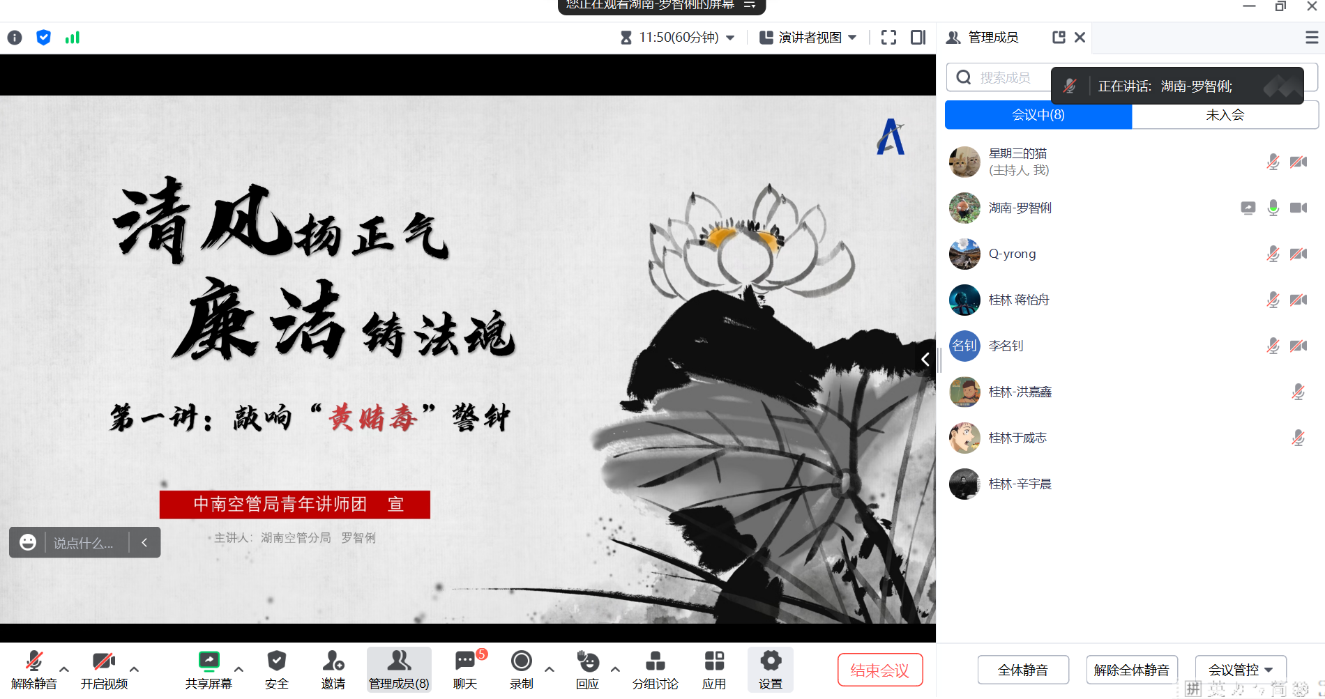 清风扬正气,廉洁铸法魂 航企通讯滚动 23年10月5日 编辑 lizhiyao 取消关注 关注 私信 (通讯员:朱雨晴)9月26日,桂林空管站气象台团支部有幸邀请到湖南空管分局气象台团总支书记罗智俐,给青年团员们带来了以“敲响黄赌毒警钟”为主题的法治教育学习课程。 罗智俐书记由浅入深,列举身边实际案例,从“黄”、“赌”、“毒”三个方面详细解析了案例的前因后果,弘扬文明正气,敲响黄赌毒警钟。此次法制宣传教育课程提高了青年团员拒防“黄赌毒”的意识,进一步增强了青年明辨是非、抵制诱惑的能力,帮助团员青年不断提升法治意识,构筑抵御“黄赌毒”侵害的思想防线。