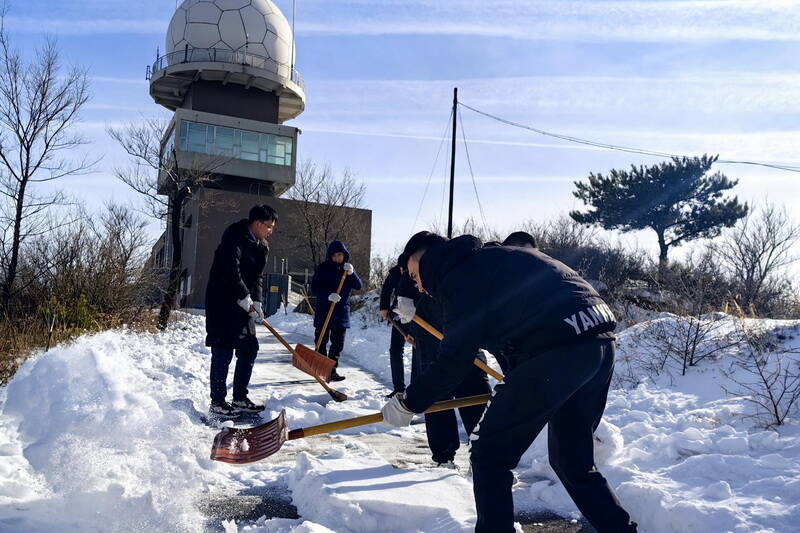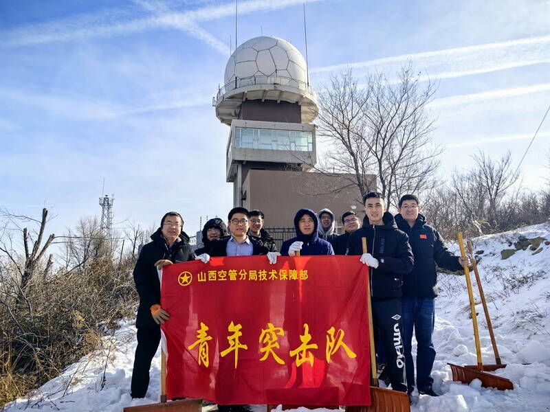 青年突击队共九名队员携带铁锹、除雪铲等清扫工具,对罕山雷达站大门口的道路进行了一场大清雪行动。在扫雪过程中,队员们不顾天寒路滑,分工明确,配合默契,大家齐心协力,经过一下午的努力,不停挥舞着手中的工具认真完成了铲雪除冰工作,为雷达站清理出一条安全通道。下山时,队员们对山腰沿途道路施撒粗盐,确保路面浮冰快速消融。