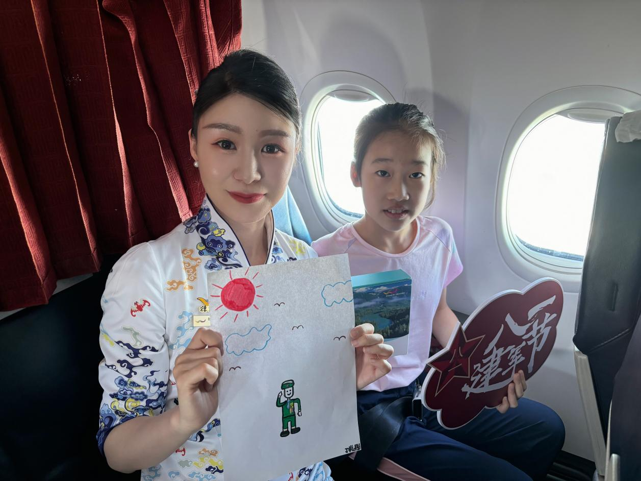 接下来,乘务组还为旅客精心准备了一系列生动有趣的互动游戏,首先是跟旅客一起叠军被环节,旅客在退伍军人员工的指导下一起将被子平铺,然后用手掌迅速按压平整,接下来是三分折叠,然后修整各个角和侧边,原本松软的被子瞬间变成方方正正、棱角分明的“豆腐块”。然后是关于建军节的有奖问答活动,旅客们纷纷参与其中,客舱氛围十分浓烈。在互动环节中,可以深深体会到旅客朋友们对于党和国家以及人民子弟兵的热爱之情。此外,乘务组还为客舱的小朋友准备了画笔,让他们画出自己心目中的军人,小朋友们充分发挥了他们灵动的想象力,画出了可爱的军人形象。