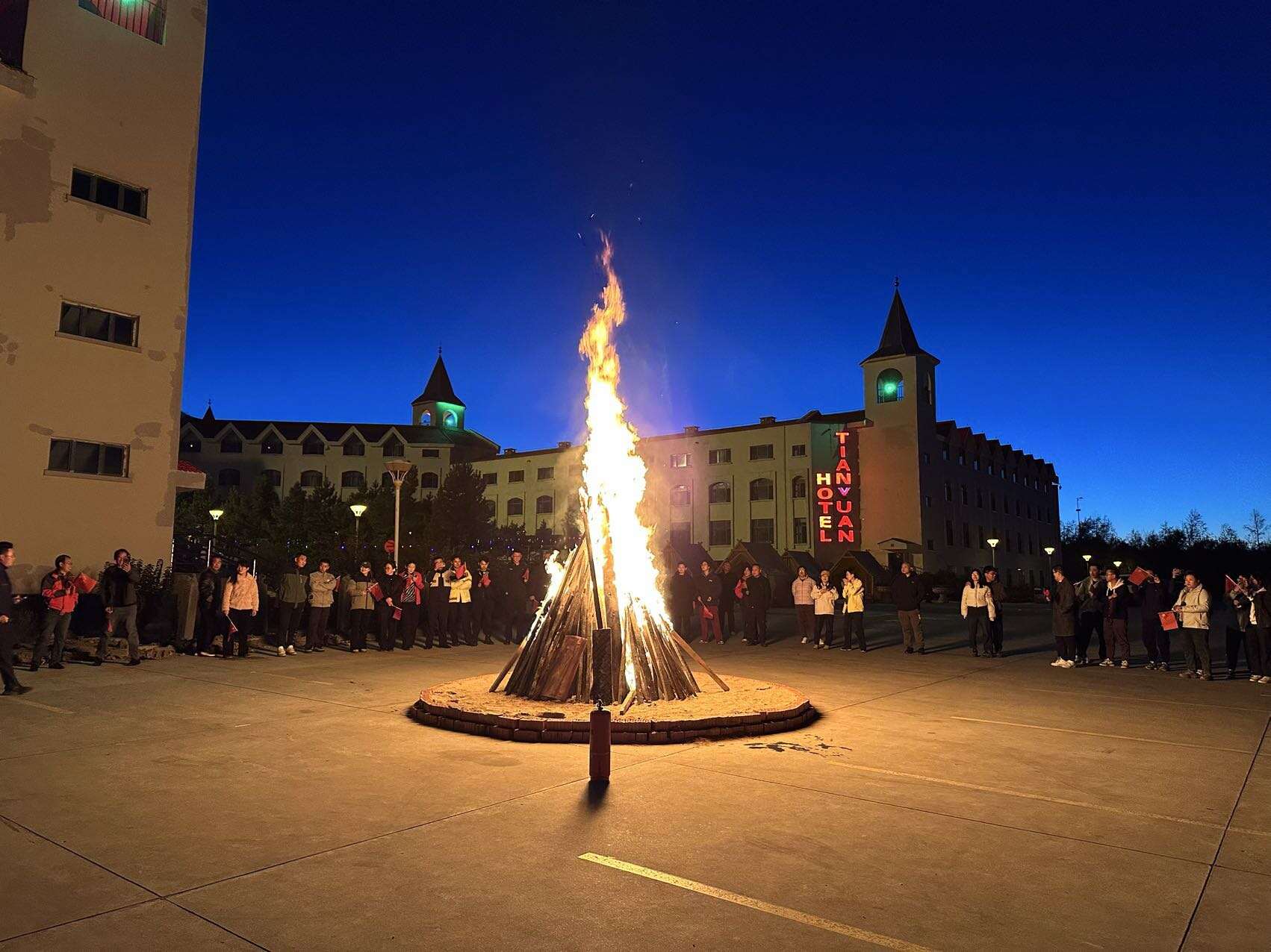 在篝火的映照下,人们手拉手围成一圈,跳起了欢快的舞蹈。大家的脸上洋溢着幸福的笑容,仿佛所有的烦恼都在这一刻烟消云散。现场的气氛达到了高潮,欢呼声、喝彩声此起彼伏,整个活动场地变成了一片欢乐的海洋。