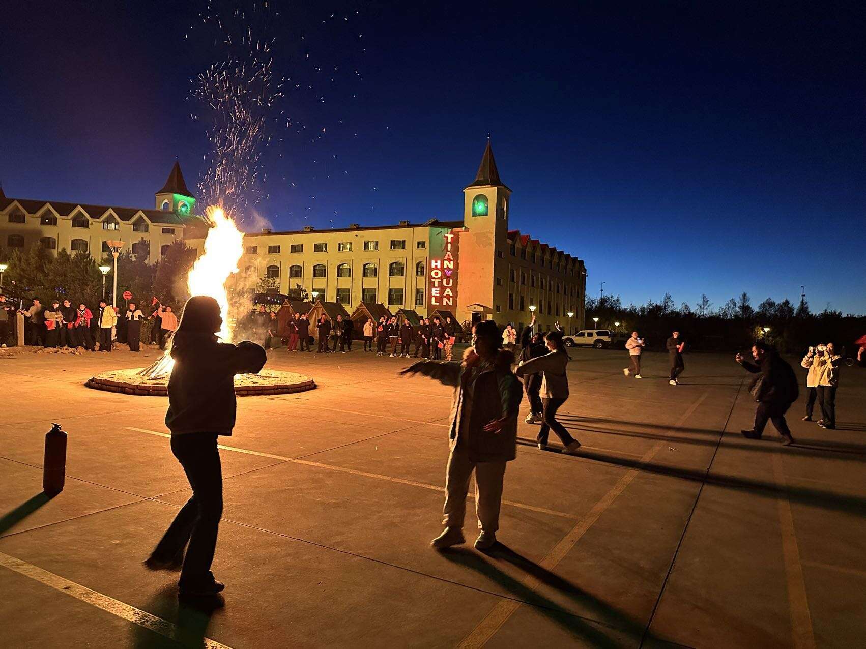 夜幕刚刚降临,喀纳斯机场与天缘山庄的活动场地内便燃起了熊熊篝火,照亮了整个夜空。现场气氛热烈,欢快的音乐声与人们的欢声笑语交织在一起,仿佛奏响了一曲欢乐的国庆赞歌。来自五湖四海的游客们,脸上洋溢着兴奋与期待的神情,纷纷围拢在篝火旁,感受着这份独特的节日氛围。