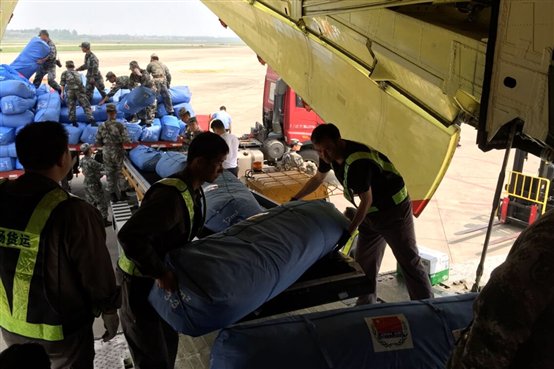 图:南京机场:一方有难八方支援,货运工作人员将抗震救灾物资装上飞机,准时、准确确保伊尔--76运输机准点从南京机场起飞,运往目的地尼泊尔!摄影:张敏!