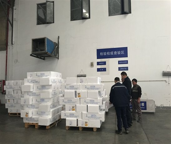 图:南京机场:一批来自国外的进港深海三文鱼冷鲜产品国际库,货运业务人员正在认真检查、核对!确保客户及时提货!摄影:张敏!