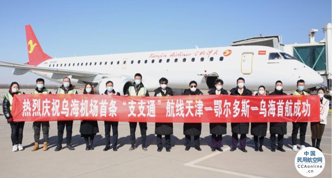 中国民用航空网讯(乌海机场:高翔报道)2月15日11时40分,随着B3100飞机平稳降落乌海机场,乌海机场首条“支支通”航线天津=鄂尔多斯=乌海首航成功。天津=鄂尔多斯=乌海航线由天津航空公司E195机型执飞,座位数121个,航班号为GS7719/7720,班期为周二、周四、周六,其中天津起飞时间8:15,鄂尔多斯起飞时间10:35,乌海到达时间11:40;乌海起飞时间12:30,鄂尔多斯到达时间13:30,天津到达时间15:50。
