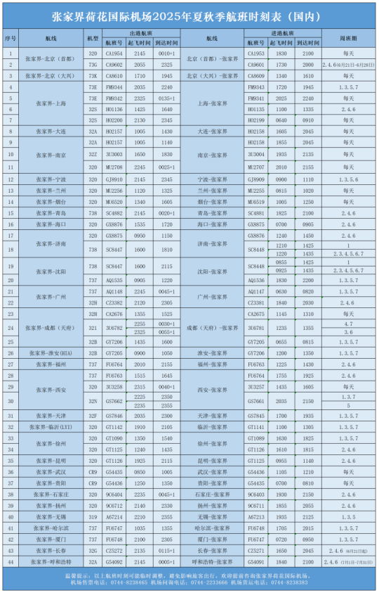随着暑期出行旺季临近,张家界机场以旅客需求为导向,深化航司合作,全面推进航线资源优化与服务品质升级,暑运期间对多条热门航线进行增开、加密,全力打造便捷舒适的暑期出行体验。