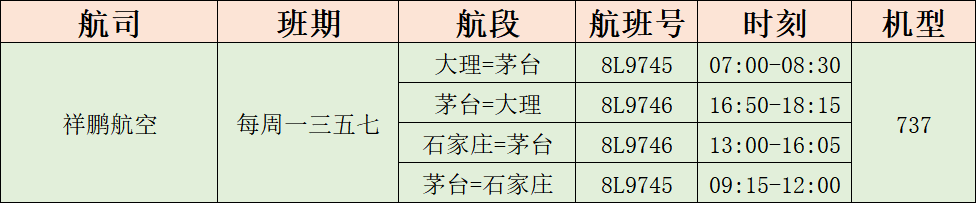 茅台机场“大理=茅台=石家庄”航线成功首航 机场要闻 航线航班 25年7月16日 编辑 通讯员mk 取消关注 关注 私信 7月11日15时许,随着由石家庄飞来的8L9746次航班平稳落地,茅台机场携手祥鹏航空执飞的“大理=茅台=石家庄”航线成功首航。 【航班信息】 该航班班期为每周1357往返,使用波音737机型执飞。 该航线的开通,将为大理、茅台、石家庄三地的经济发展、文化交流与旅游合作注入新的活力,促进不同地域文化的碰撞与融合。 遵义茅台机场