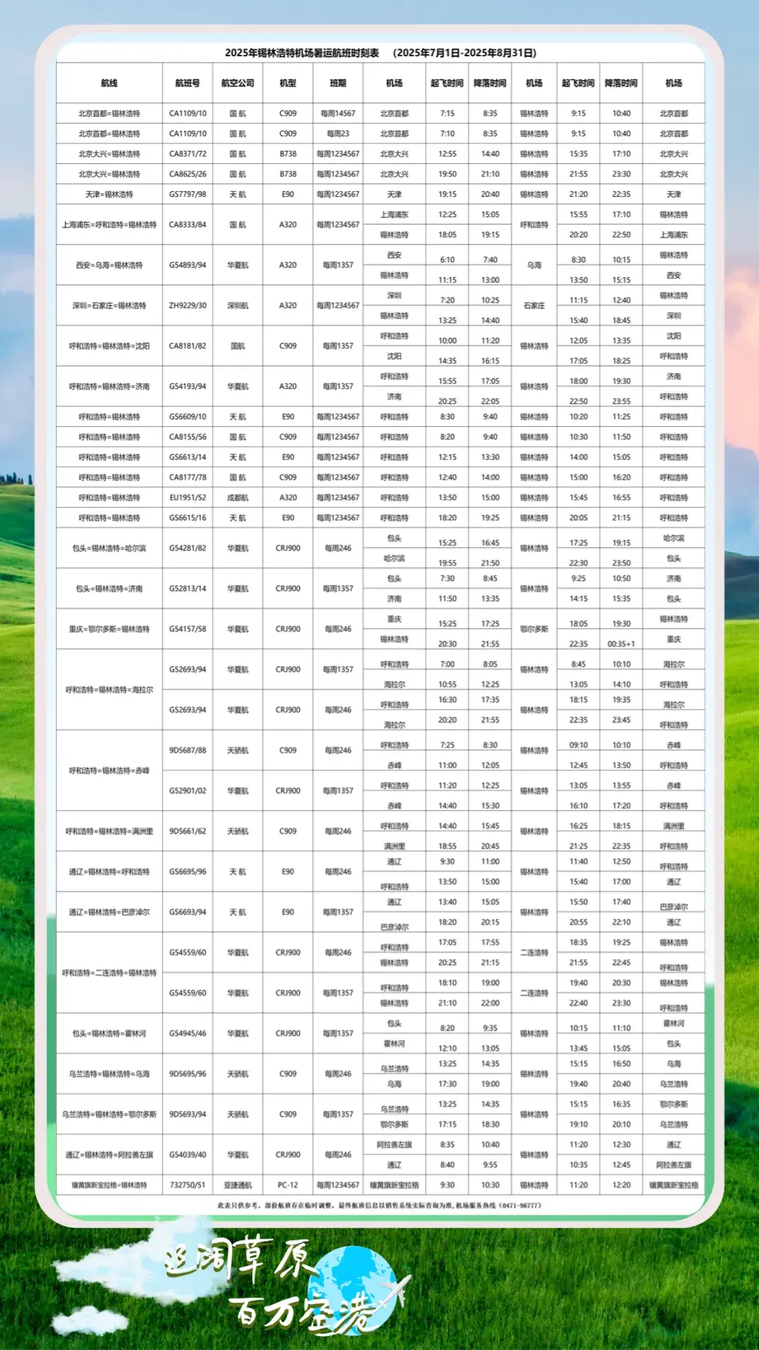锡林浩特机场这条航线恢复通航 机场要闻 航线航班 来源:锡盟融媒 7月24日 编辑 通讯员mk 取消关注 关注 私信 7月22日 通辽⇌锡林浩特⇌阿拉善左旗航线 恢复通航 该航线以锡林浩特为经停点,串联起内蒙古东部草原、中部地质奇观与西部沙漠三大旅游带。 锡林浩特机场暑运航班时刻表 航旅资讯锡林浩特机场