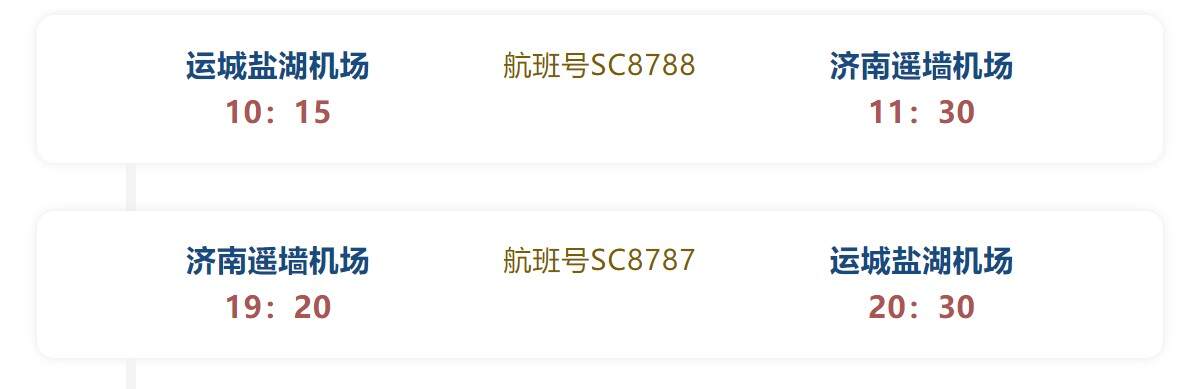 运城机场将恢复济南航线 机场要闻 航线航班 来源:运城日报 10月10日 编辑 通讯员mk 取消关注 关注 私信 自10月26日起,中国民航开始执行冬季航班计划,此次航班换季,运城盐湖机场将恢复济南航线,进一步方便旅客出行。 据悉,运城往返济南的航线由山东航空执飞,每周一、三、五、日各执行一班, 航班号为SC8787/8788,执飞机型为波音737-800型客机。 航班换季运城机场