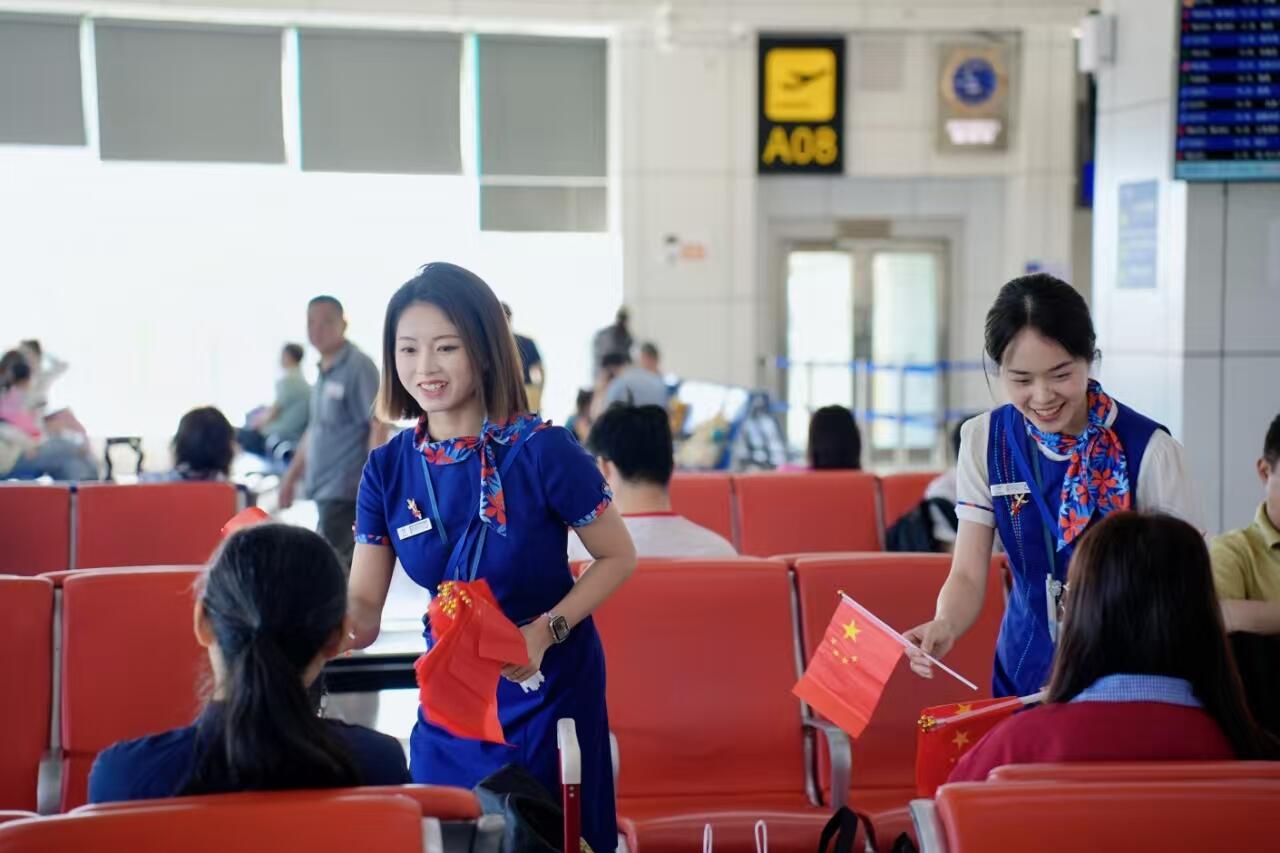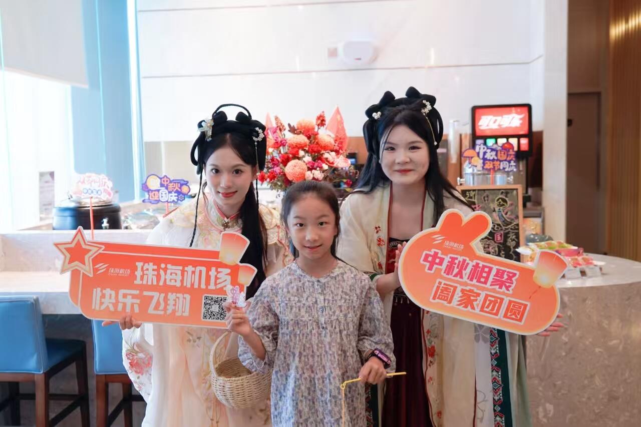 珠海机场积极践行“人民航空为人民”的宗旨,于国庆期间开展“迎中秋、庆国庆”旅客体验活动,同时,组织志愿者团队为旅客提供值机引导、行李协助、安检咨询等贴心服务。针对首乘旅客、长者及无陪儿童等特殊群体,提供从入口到登机的全程陪护与个性化关怀。候机楼内亦装点一新,以节日氛围传递深情问候,与广大旅客共庆新中国76周年华诞。