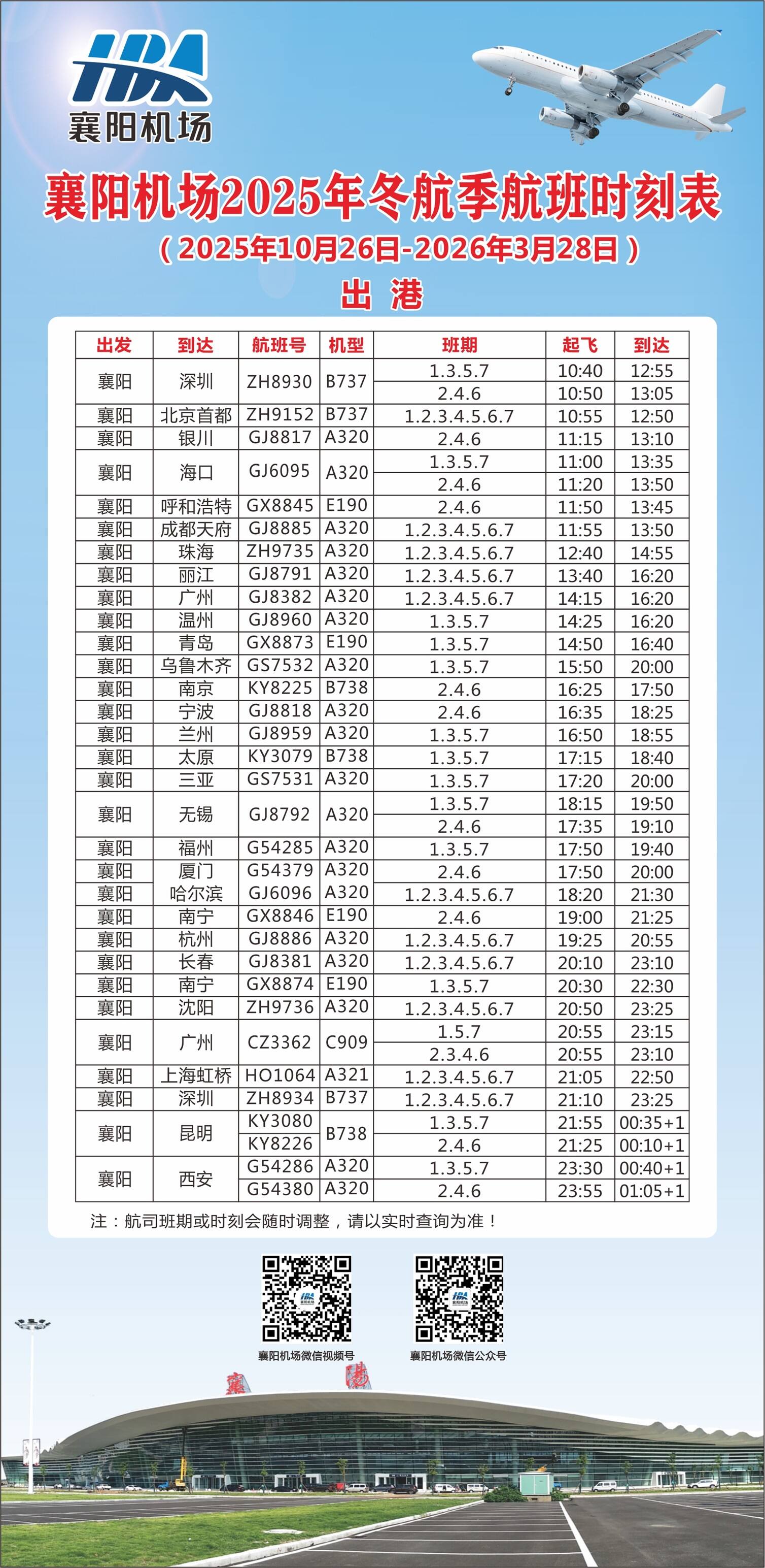 部分航线的航班号变更:深圳航空执飞的襄阳=深圳早班航线,航班号由ZH8931/2变更为ZH8929/30,长龙航空执飞的多条航线航班号均有变更。此外,襄阳飞青岛、南宁、呼和浩特等航线班期也有调整,建议旅客在购票时务必注意起飞时刻及航班号,航班最终以实际执行为准。旅客可登陆航空公司官网或拨打客服电话咨询,还可以通过飞常准、航旅纵横等官方APP随时了解航班动态,合理安排出行。