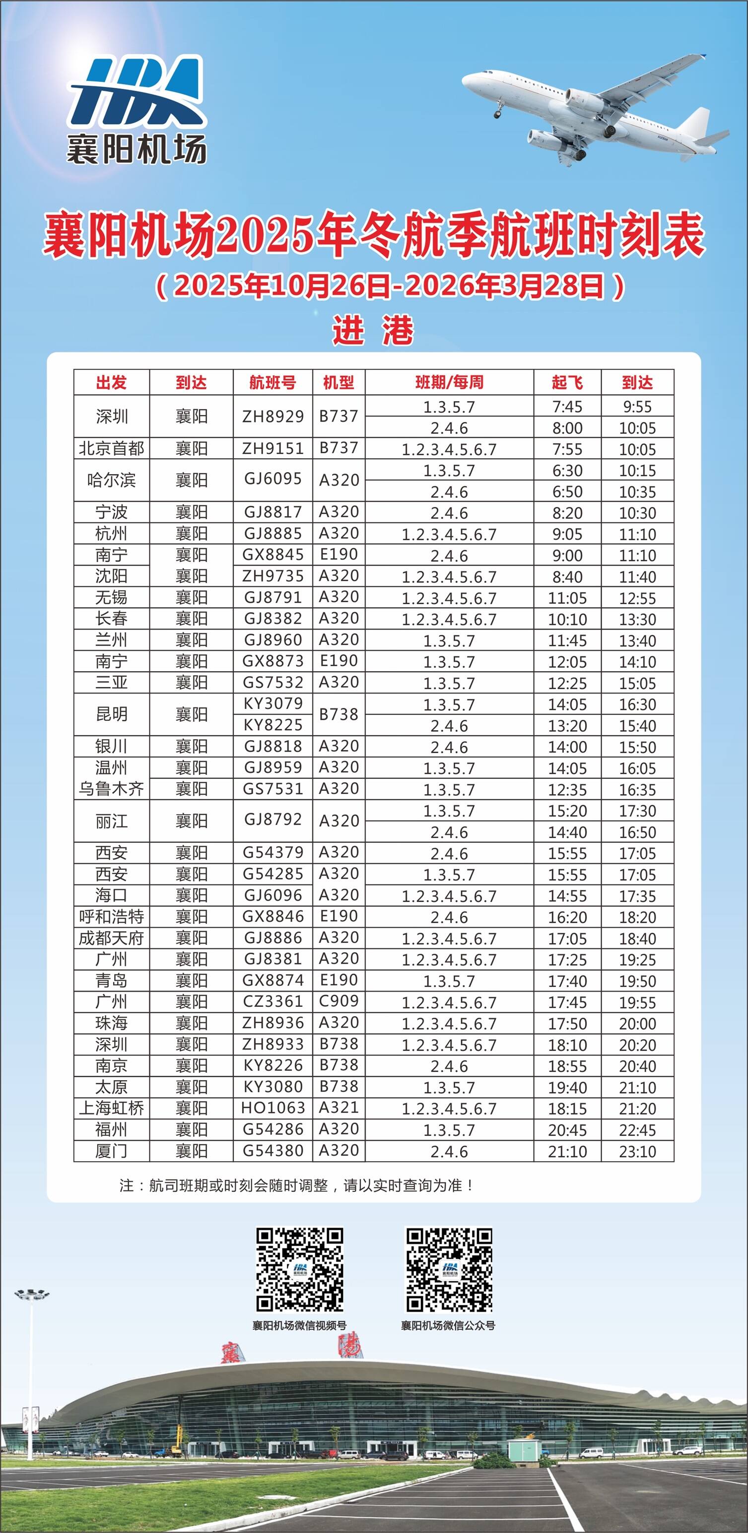 中国民用航空网讯 通讯员曾艳、黄靖清报道:2025年10月26日起,襄阳机场执行冬航季航班计划,将持续至2026年3月28日,共计154天。经襄阳市交通运输局会同襄阳机场联系协调,新航季共有8家航空公司,在襄阳机场通航28个城市,其中恢复太原航点。考虑冬航季市场特点,重点将夏航季新增的乌鲁木齐=襄阳=三亚航线顺延至冬航季,另外对无锡、丽江航线进行了加密。