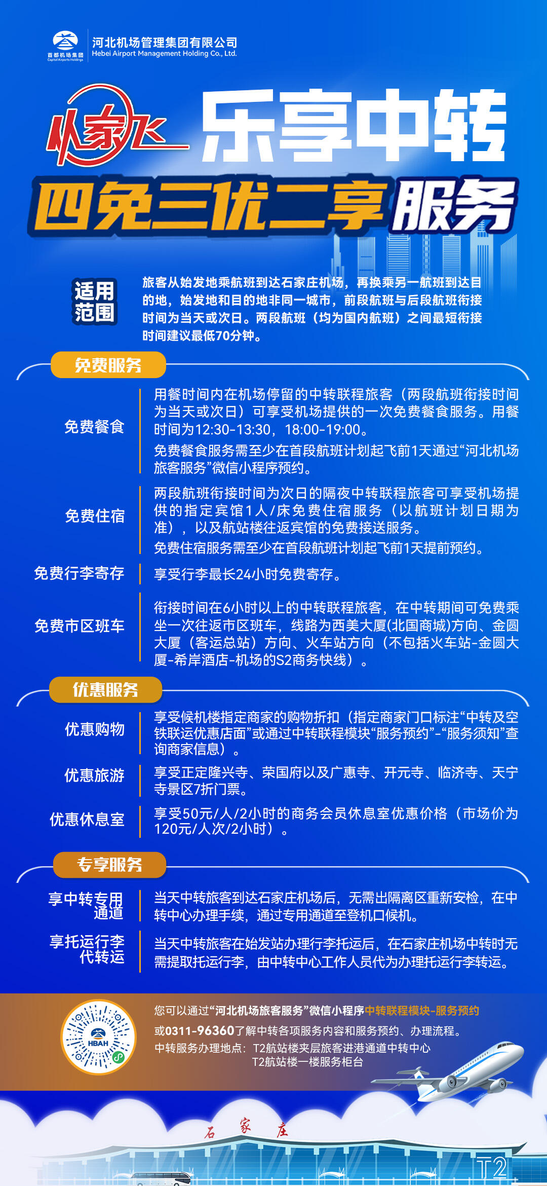 航班换季后,3家航空公司执飞上海、石家庄、成都、西安、包头等城市航线,经石家庄机场中转联程可抵达全国数十座城市。目前,从家飞 乐享中转“四免三优二享”服务包括免费餐食、免费住宿、免费行李寄存、免费市区班车、优惠购物、优惠旅游、优惠休息室、享中转专用通道、享托运行李代转运等服务。旅客可以通过“河北机场旅客服务”微信小程序或拨打“0311-96360”了解服务详情。