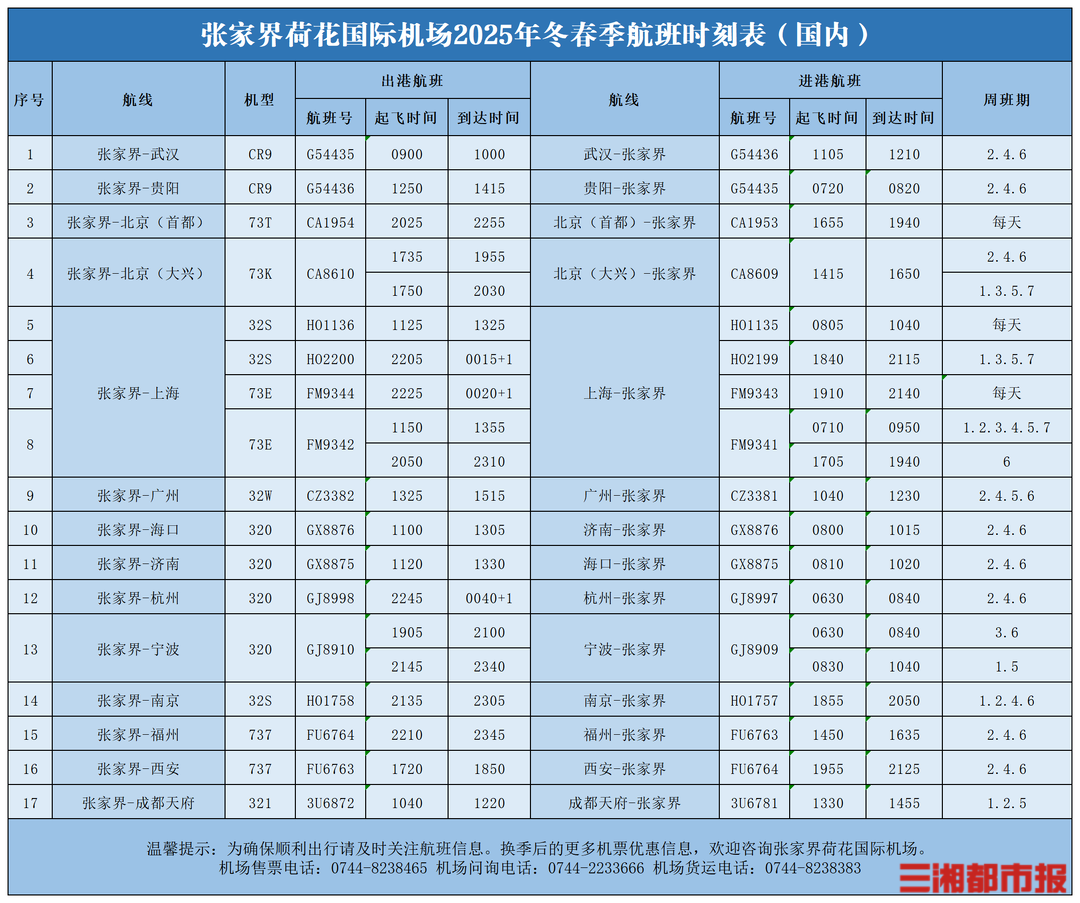 今年10月26日至2026年3月28日,张家界机场将执行冬春航季航班计划。新航季周客运航班量258架次,计划执行航线21条,通达国内外24个城市。较去年同期新增并加密多条航线,进一步提升航线网络覆盖能力和运行效率。