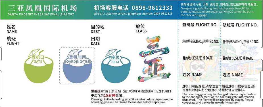 据了解,新版国内登机牌以“航空+旅文”为理念,在设计上深度融合三亚地域特色,旨在打造为集实用、地域文化与情感体验于一体的“三亚城市移动名片”。新版国内登机牌整体色调以清新的海洋蓝与椰林绿为主,以机场建筑为视觉基底,巧妙融入多处旅游景点及海滩、椰树等热带元素,搭配三亚机场推荐官“菲菲”“尼克斯”的可爱形象,生动勾勒出三亚独特的滨海风情。在功能呈现上,新版国内机牌进行了升级,登机口、时间、座位等关键信息经优化布局,字体加粗、色彩对比鲜明,使旅客一目了然、从容启程。