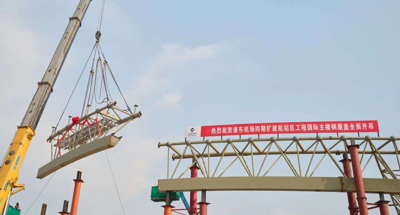 2月1日,浦东机场四期扩建工程航站区工程国际主楼钢屋盖全面开吊仪式举行。机场集团总裁周浩、建工集团总裁叶卫东、建科集团总裁夏冰、机场集团总工程师李金良、机场集团副总裁严佳庆、华建集团党委副书记龙革、建工集团副总裁陆峰、建科集团总工程师周红波共同推杆宣布国际主楼钢屋盖全面开吊,T3航站区工程正式转入钢结构安装的核心攻坚阶段。