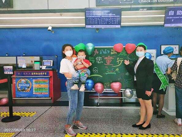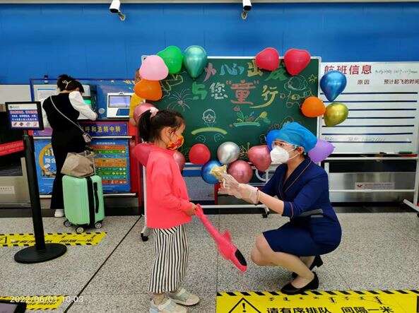 活动当天,每个值机柜台前点缀着星星点点的气球,黑板上也画满了卡通人物,并写着浓烈氛围的祝福语,工作人员首先为小朋友进行手部消毒工作,同时细致的用白板为小朋友讲解着乘机流程以及一些航空器的常识,并将早已准备好的棒棒糖花束送给每位小朋友,陪孩子们玩出“六一”新花样,让小朋友在旅途中依然能感受到浓厚的节日氛围。此次六一活动备受小朋友喜爱,也收获家长和旅客的高度赞扬,为小朋友的童年时光留下了美好的回忆。
