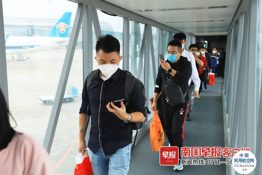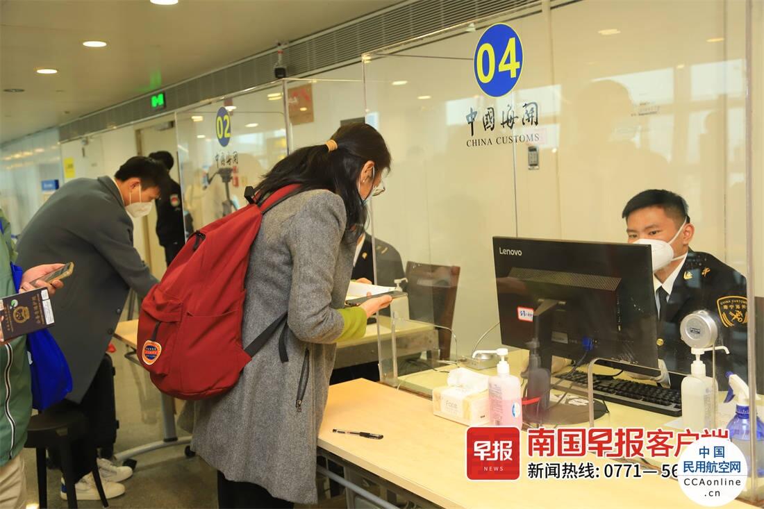 当天下午,南国早报客户端记者在现场看到,这趟航班的旅客下机后,在工作人员指引下,有序进行海关健康申报、检验检疫、边防检查、入境通关、行李提取、海关检查等环节,完成入境手续后即可开启下一段行程。其中,不少旅客直接在南凭铁路吴圩机场站转乘动车回家。