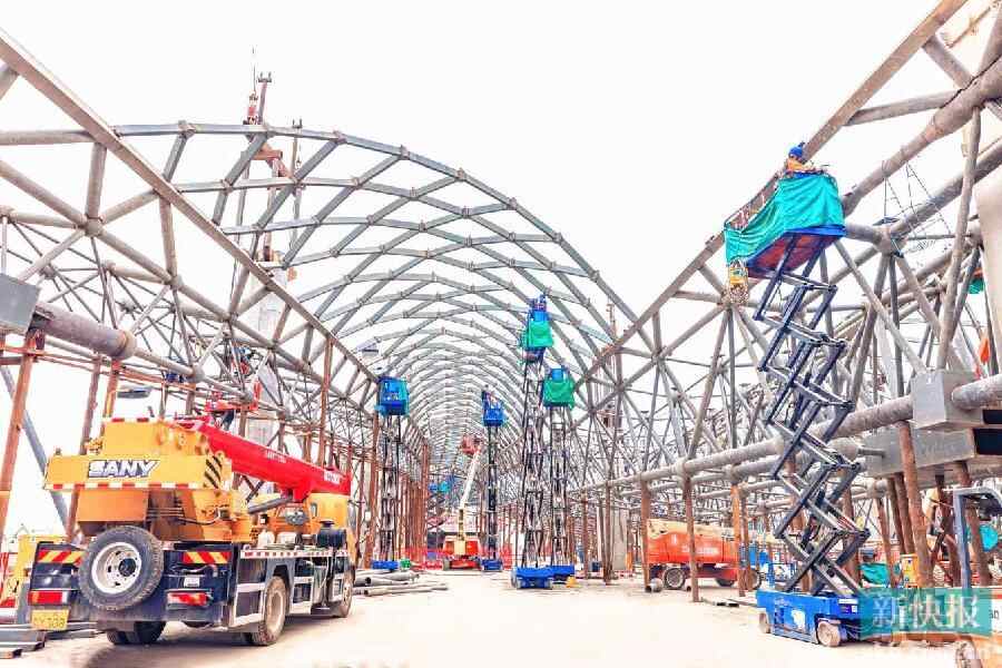 目前本工程主体结构已全面封顶,正在冲刺钢网架全面封顶,屋面、幕墙、机电安装工程已逐步分片铺开施工,预计年中实现航站楼全面闭水,为下一步精装修等专业工程全面铺开奠定基础。