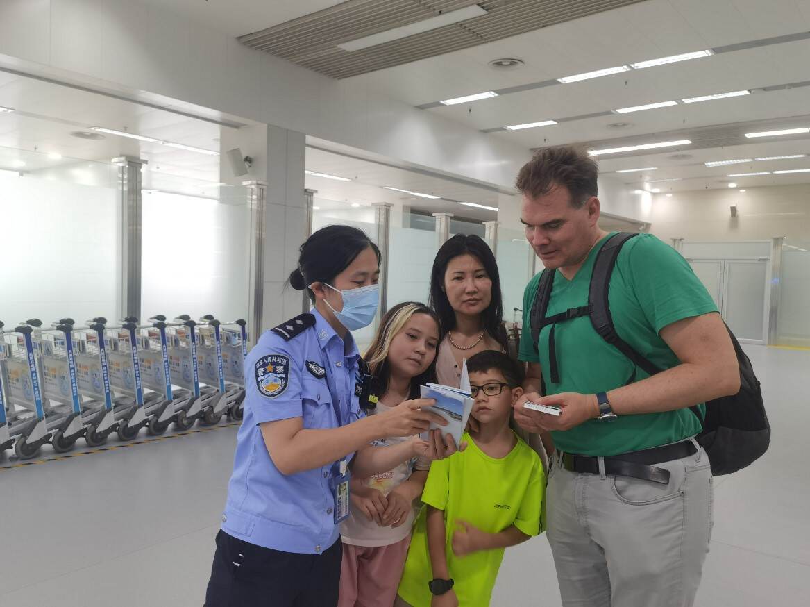 7月30日在办理9C8789石家庄前往韩国的出境航班时,石家庄出入境边防检查站执勤二队民警冯雅婷正在给来自瑞士的一家四口介绍144小时过境免签政策,“持有效国际旅行证件和144小时内确定日期及座位的联程客票从我口岸过境前往第三国(地区),可免办签证在规定区域内停留不超过144小时,停留期间可从事旅游、商务、访问、探亲等短期活动(符合与我国签署互免签证协定或我单方面免签政策的,可从其规定)”。并为旅客讲解了石家庄正定国际机场口岸为航司配发外国人入境登记卡,外国旅客可以在飞机上完成填报,线上自助填报电子终端旅客可以线上完成来华信息申报,最大限度减少现场排队候检时间。