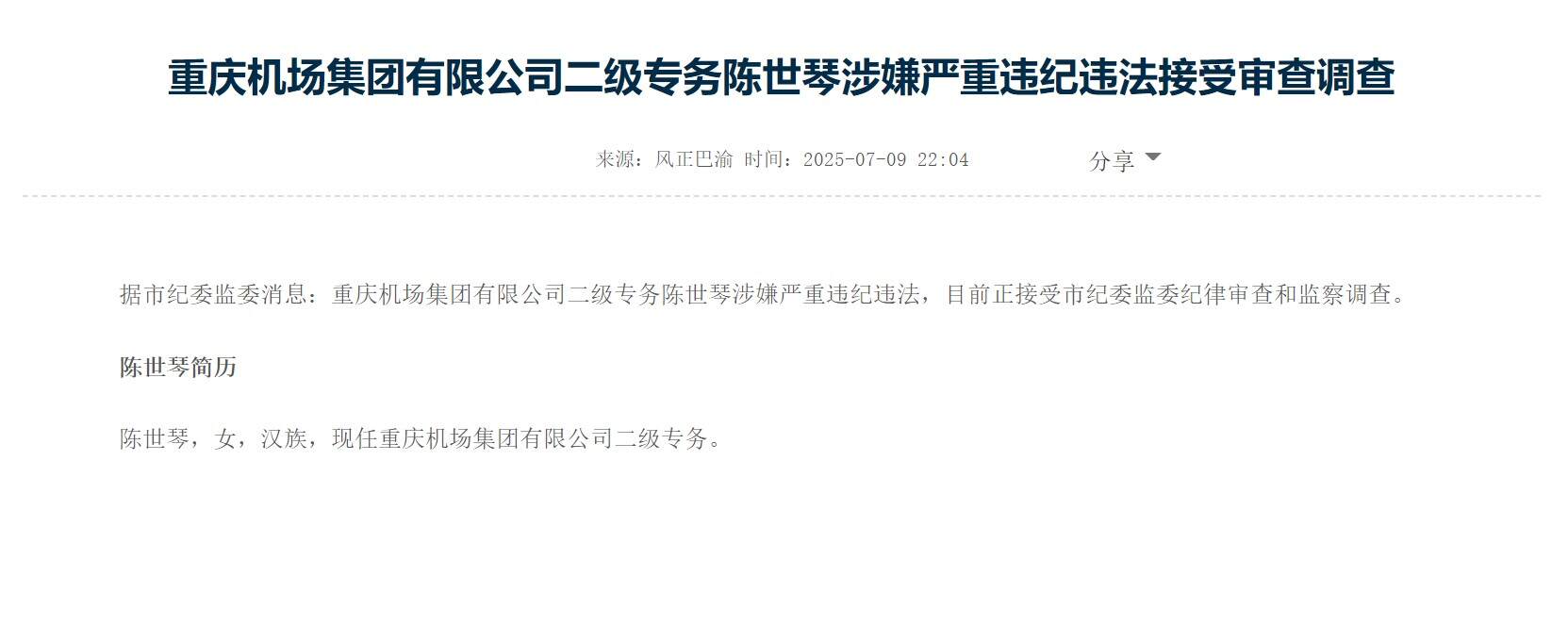 据重庆市纪委监委消息:重庆机场集团有限公司二级专务陈世琴、重庆机场集团有限公司原二级专务李光彩涉嫌严重违纪违法,目前正接受重庆市纪委监委纪律审查和监察调查。
