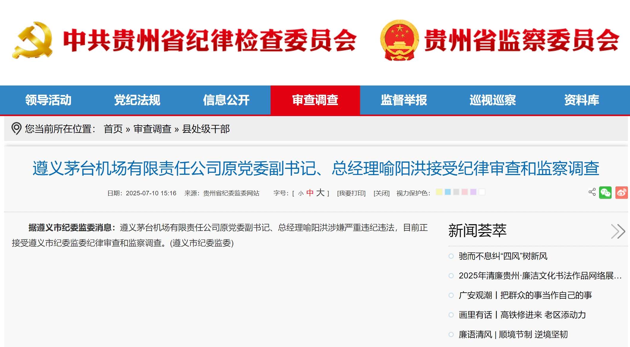 遵义茅台机场原总经理喻阳洪被查 机场头条 民航反腐 7月10日 编辑 通讯员mk 取消关注 关注 私信 据贵州省遵义市纪委监委消息:遵义茅台机场有限责任公司原党委副书记、总经理喻阳洪涉嫌严重违纪违法,目前正接受遵义市纪委监委纪律审查和监察调查。 喻阳洪(资料图) 公开资料显示,喻阳洪曾任仁怀市副市长、贵州遵义茅台机场有限责任公司总经理等职,2023年卸任,至此番被查。 民航反腐遵义茅台机场