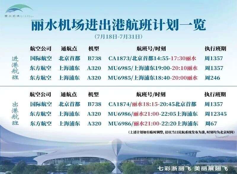 7月18日,丽水机场正式通航,首航日丽水机场开通至北京首都、上海浦东两条航线。