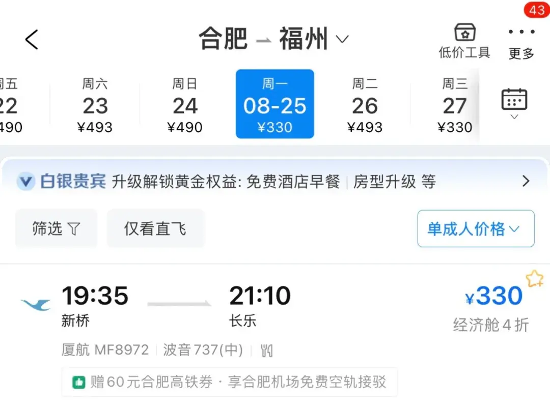 • 福州→合肥 MF8971:17:10起飞 18:45抵达
