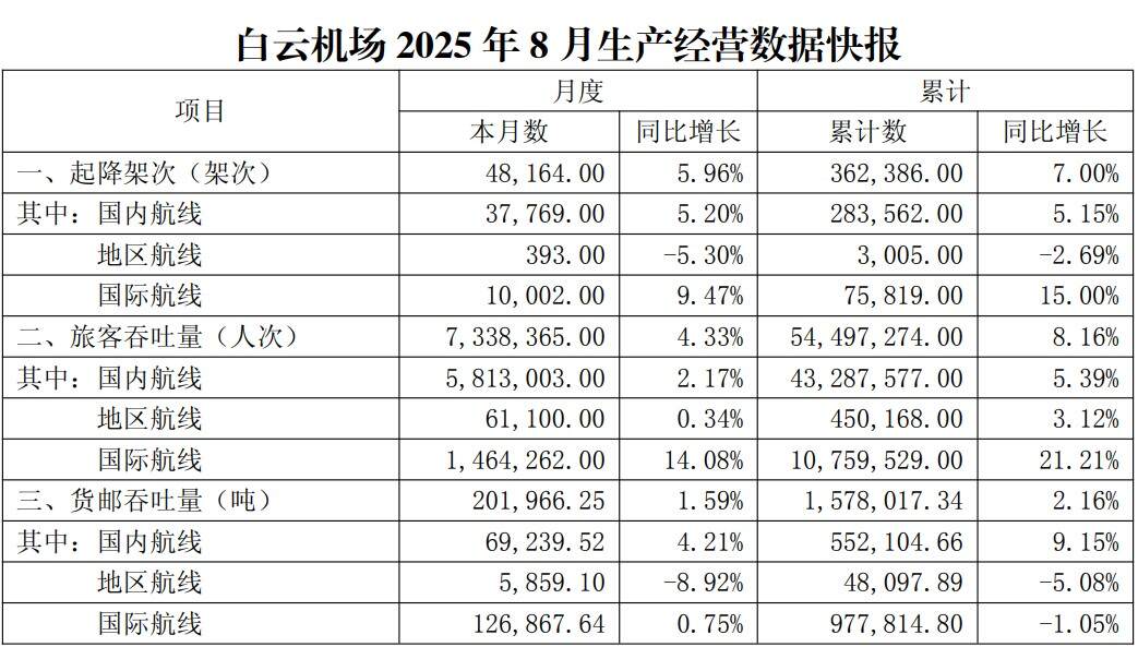 白云机场:8月旅客吞吐量同比增长4.33% 机场头条 数据报告 9月12日 编辑 通讯员mk 取消关注 关注 私信 白云机场发布 8 月生产经营数据快报,8 月份,机场起降架次 48164 架次,同比增长 5.96%;旅客吞吐量 733.84 万人次,同比增长 4.33%;货邮吞吐量 20.2 万吨,同比增长 1.59%。 广州白云机场