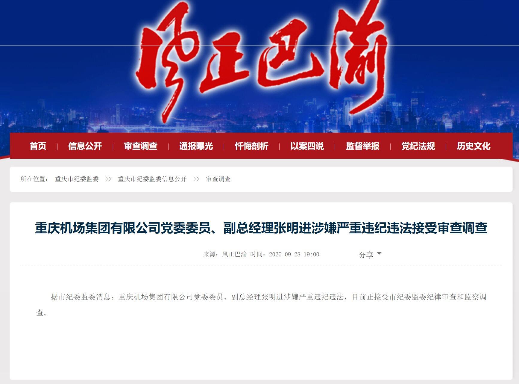 据重庆市纪委监委消息:重庆机场集团有限公司党委委员、副总经理张明进涉嫌严重违纪违法,目前正接受市纪委监委纪律审查和监察调查。